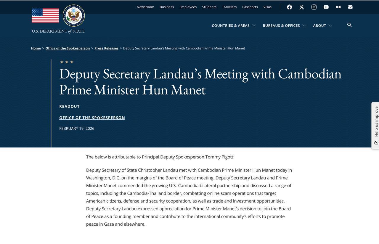 អនុរដ្ឋលេខាធិការ លោក Christopher Landau បានជួបជាមួយសម្តេចធិបតី ហ៊ុន ម៉ាណែត នាយករដ្ឋមន្ត្រីកម្ពុជា នៅថ្ងៃនេះ នៅរដ្ឋធានីវ៉ាស៊ីនតោន ឌីស៊ី ស្តីពីការរៀបចំកិច្ចប្រជុំក្រុមប្រឹក្សាភិបាលសន្តិភាព