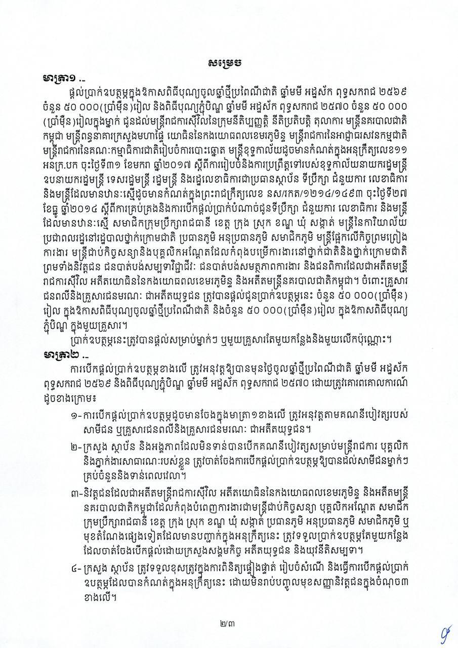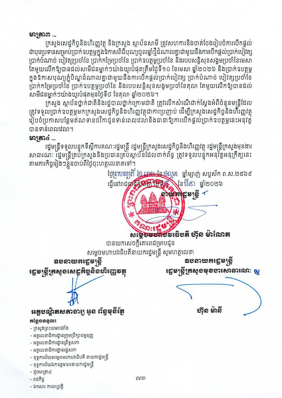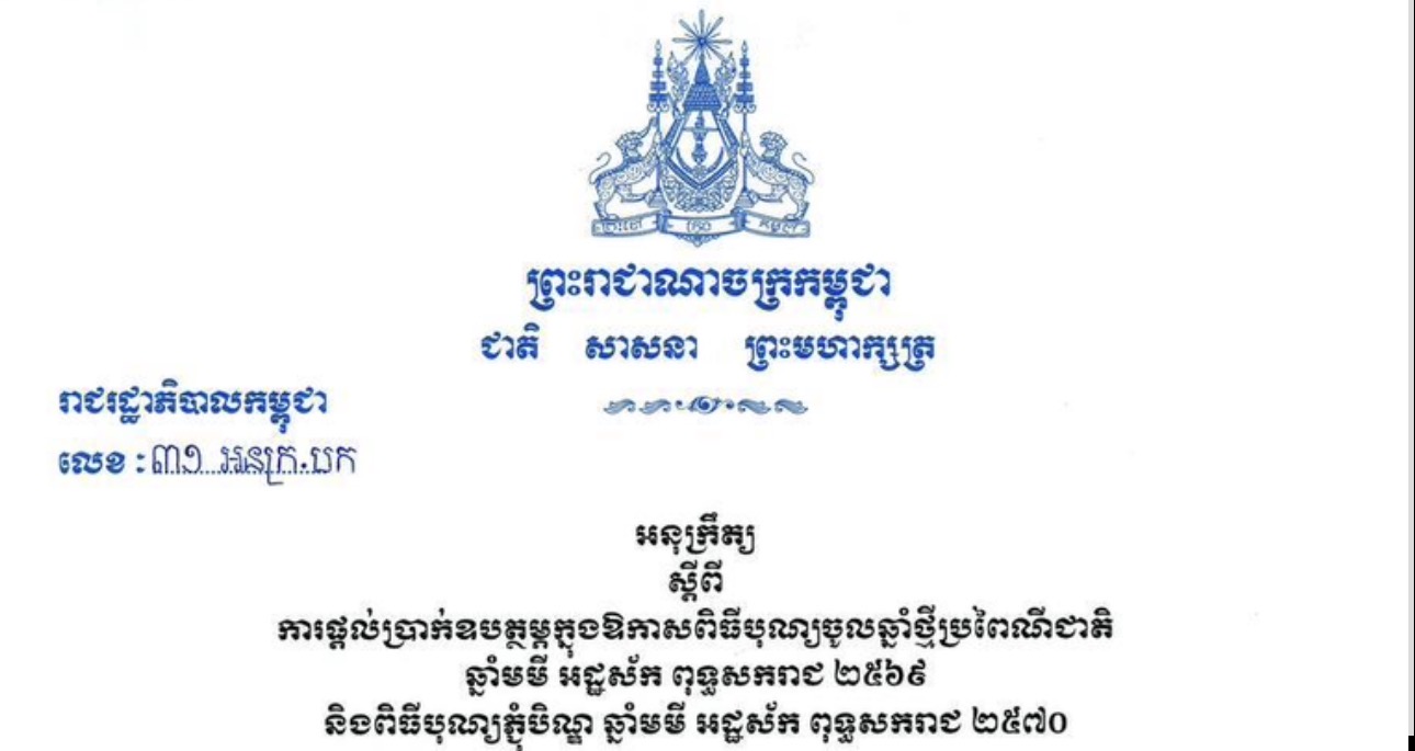 សម្តេចបវរធិបតី ហ៊ុន ម៉ាណែត ចេញអនុក្រឹត្យ ស្តីពីការផ្តល់ប្រាក់ឧបត្ថម្ភ ក្នុងឱកាសពិធីបុណ្យចូលឆ្នាំថ្មី ប្រពៃណីជាតិ ឆ្នាំមមី អដ្ឋស័ក ពុទ្ធសករាជ ២៥៦៩ និងពិធីបុណ្យភ្ជុំបិណ្ឌ ឆ្នាំមមី អដ្ឋស័ក ពុទ្ធសករាជ ២៥៧០