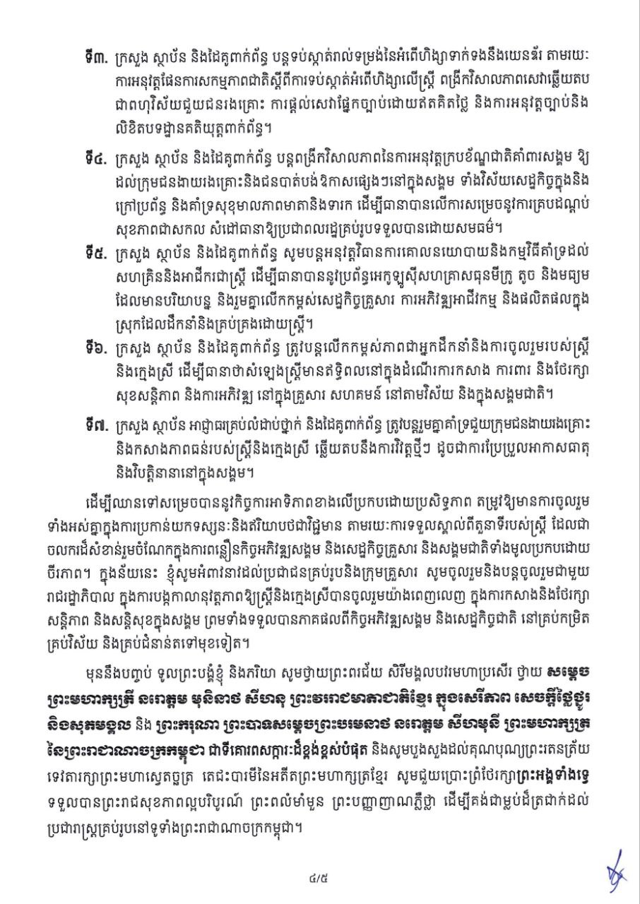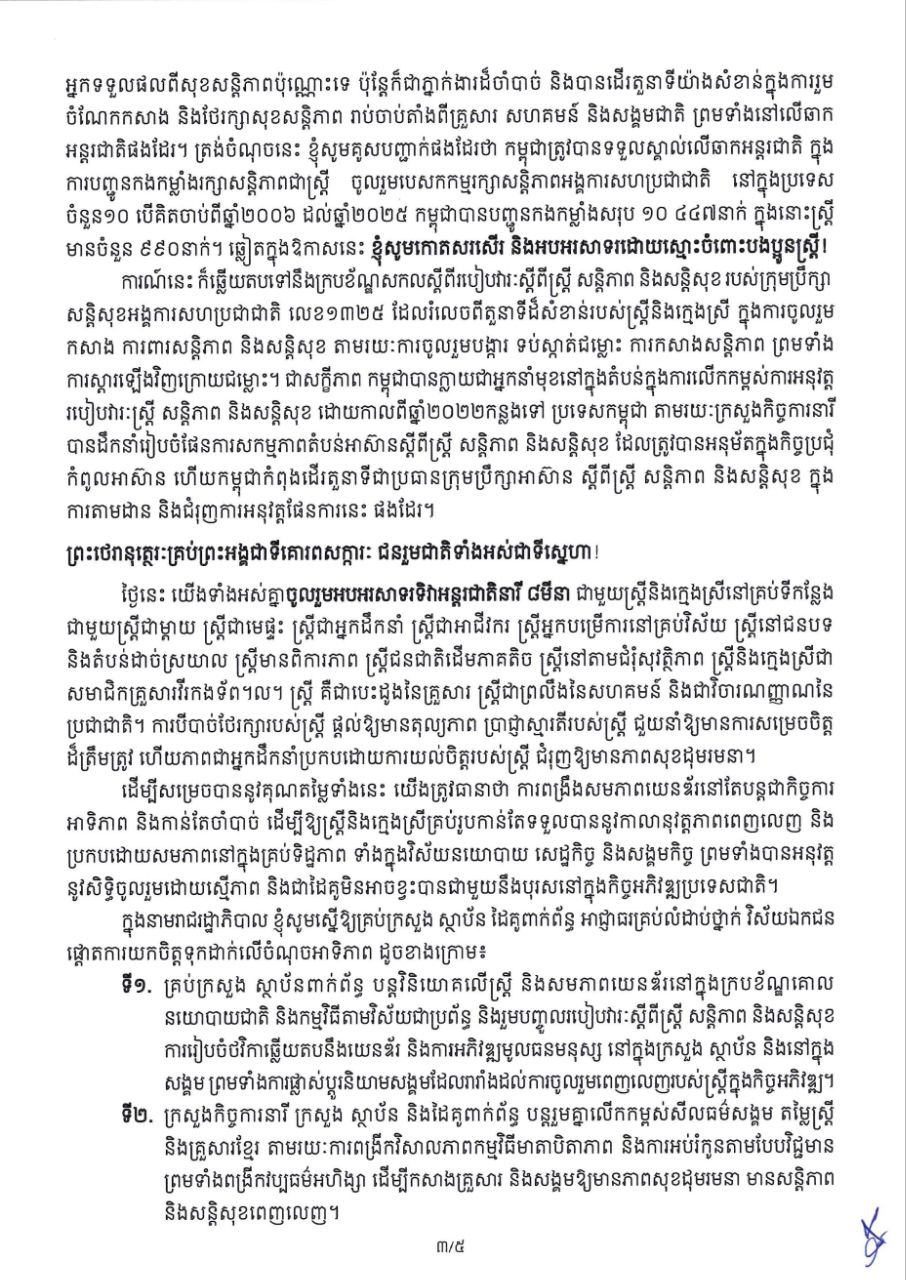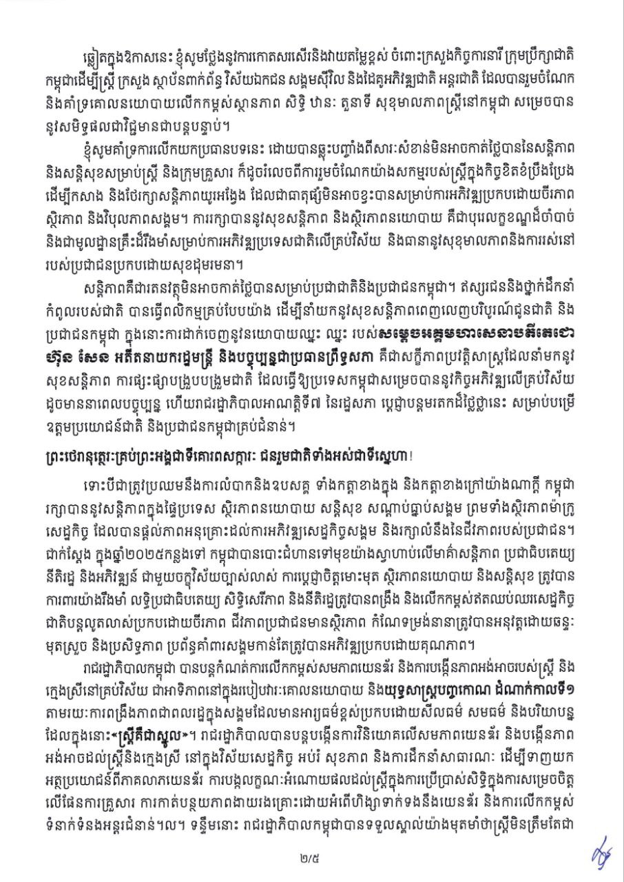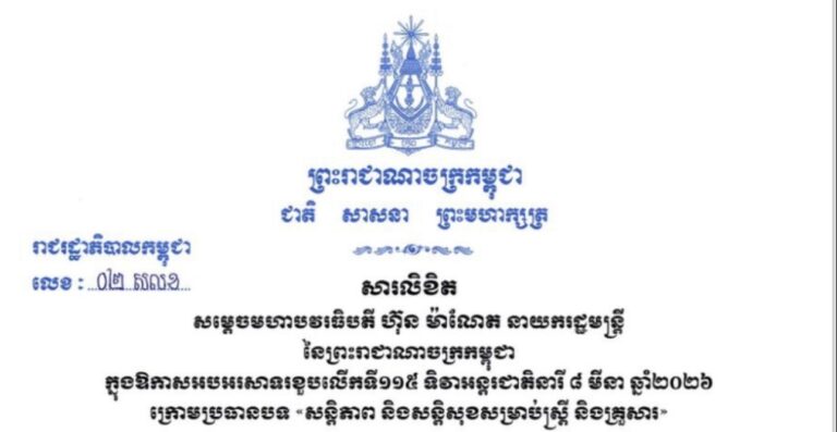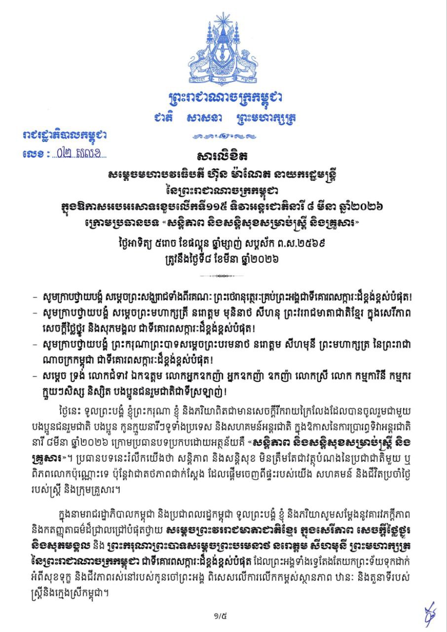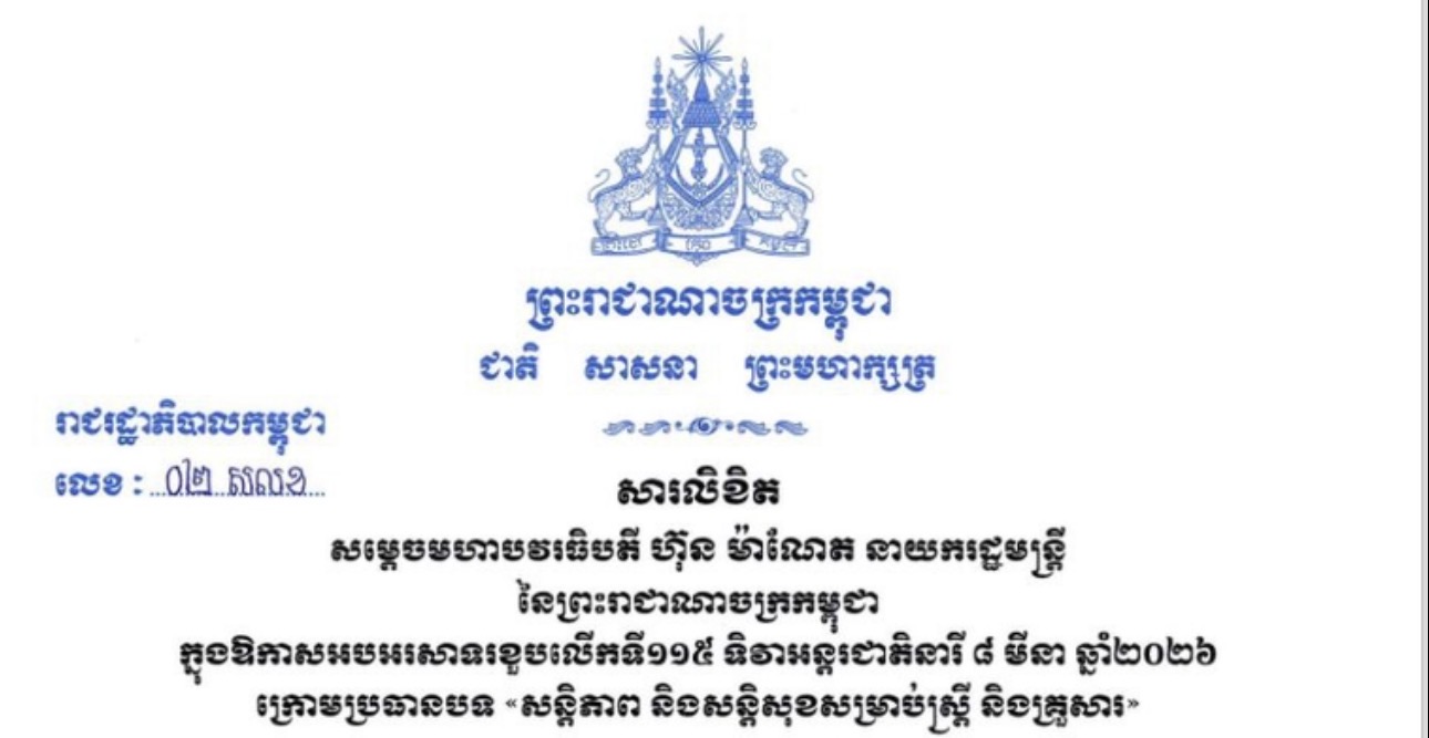 សារលិខិត សម្តេចមហាបវរធិបតី ហ៊ុន ម៉ាណែត ក្នុងឱកាសអបអរសាទរខួបលើកទី១១៥ ទិវាអន្តរជាតិនារី ៨ មីនា ឆ្នាំ២០២៦ ក្រោមប្រធានបទ “សន្តិភាព និងសន្តិសុខសម្រាប់ស្ត្រី និងគ្រួសារ»