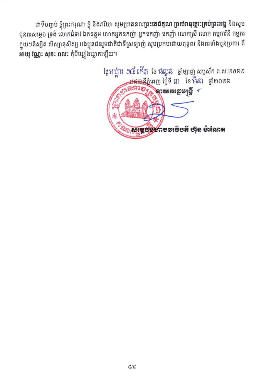 ភ្នំពេញ៖ សារលិខិត សម្តេចមហាបវរធិបតី ហ៊ុន ម៉ាណែត នាយករដ្ឋមន្ត្រី នៃព្រះរាជាណាចក្រកម្ពុជា ក្នុងឱកាសអបអរសាទរខួបលើកទី១១៥ ទិវាអន្តរជាតិនារី ៨ មីនា ឆ្នាំ២០២៦ ក្រោមប្រធានបទ “សន្តិភាព និងសន្តិសុខសម្រាប់ស្ត្រី និងគ្រួសារ»។