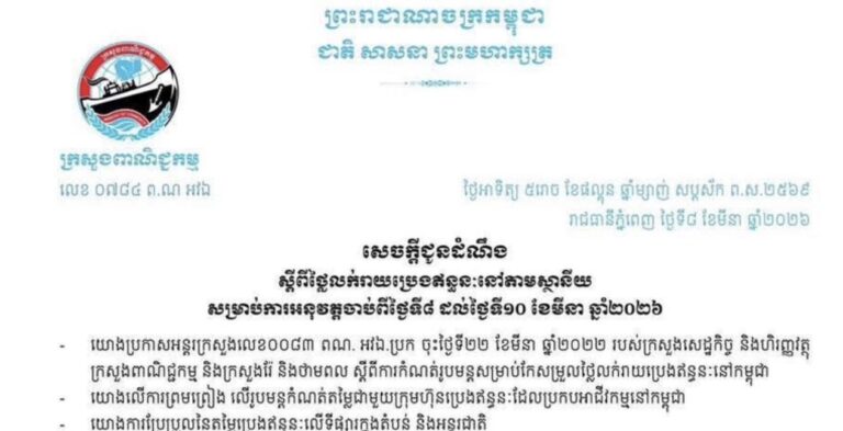 Home » ក្រសួងពាណិជ្ជកម្ម ចេញសេចក្តីជូនដំណឹង ស្តីពីថ្លៃលក់រាយប្រេងឥន្ធនៈនៅតាមស្ថានីយ សម្រាប់ការអនុវត្តចាប់ពីថ្ងៃទី៨ ដល់ថ្ងៃទី១០ ខែមីនា ឆ្នាំ២០២៦