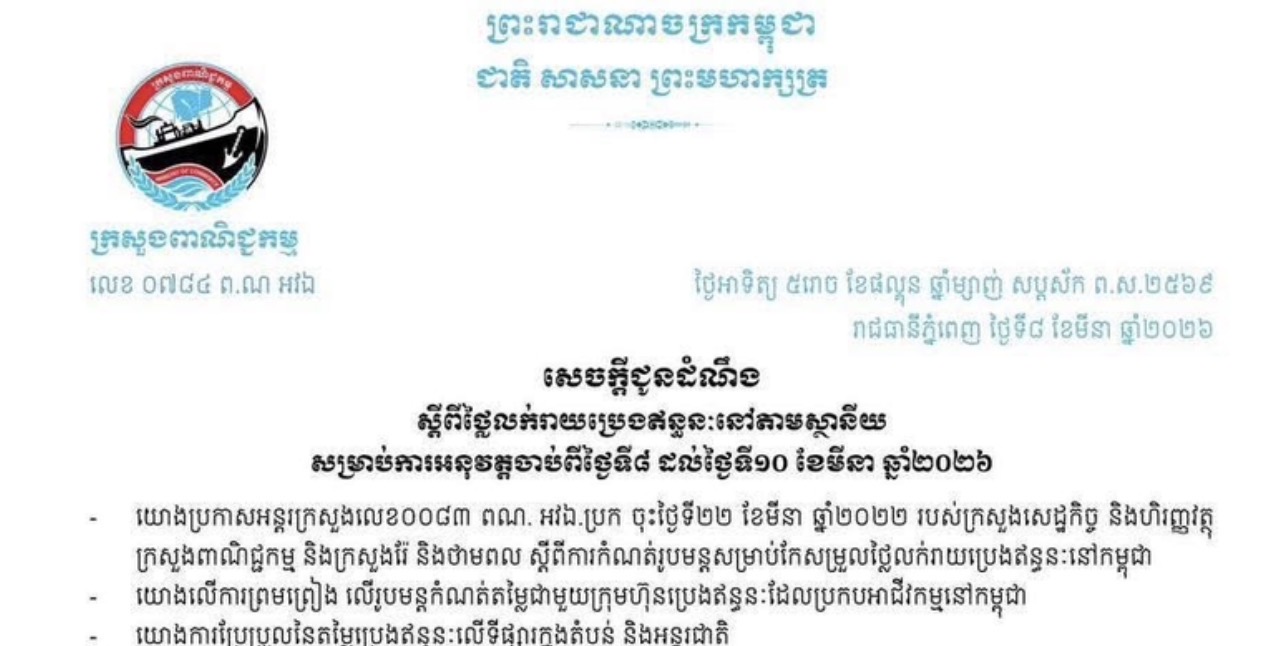 ក្រសួងពាណិជ្ជកម្ម ចេញសេចក្តីជូនដំណឹង ស្តីពីថ្លៃលក់រាយប្រេងឥន្ធនៈនៅតាមស្ថានីយ សម្រាប់ការអនុវត្តចាប់ពីថ្ងៃទី៨ ដល់ថ្ងៃទី១០ ខែមីនា ឆ្នាំ២០២៦