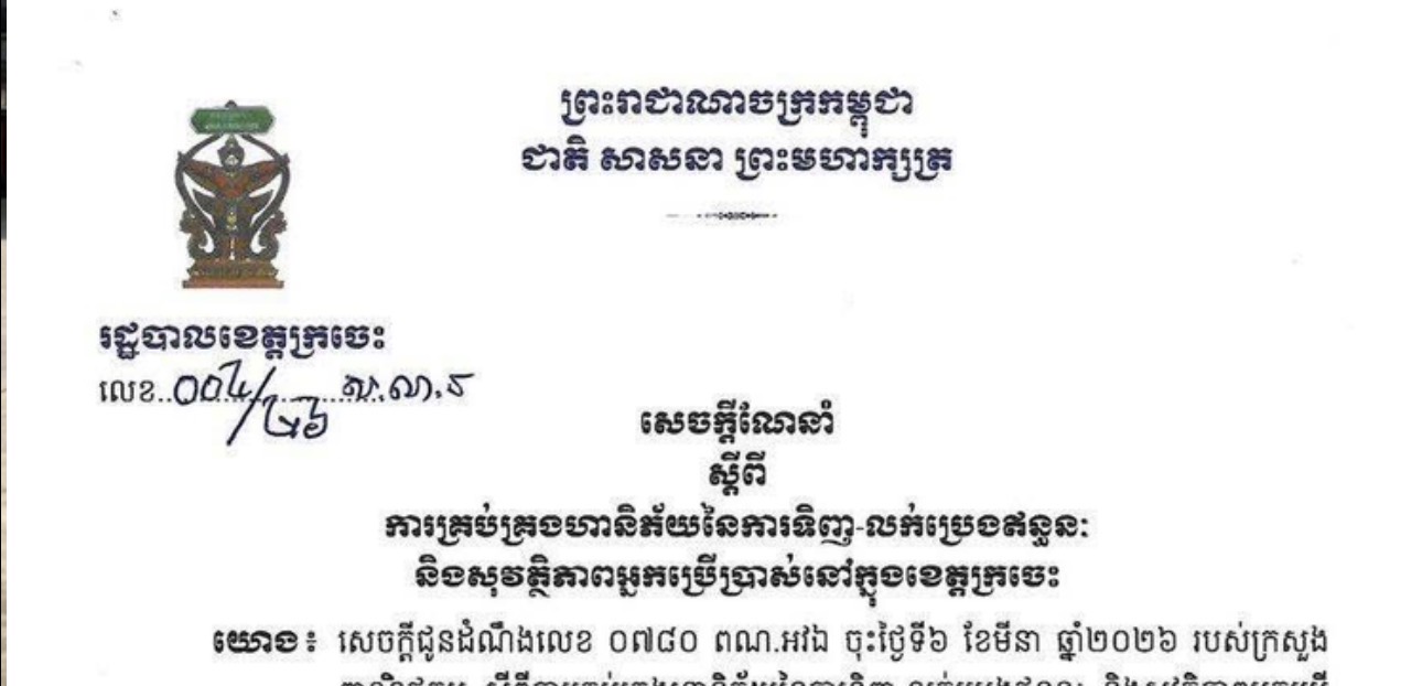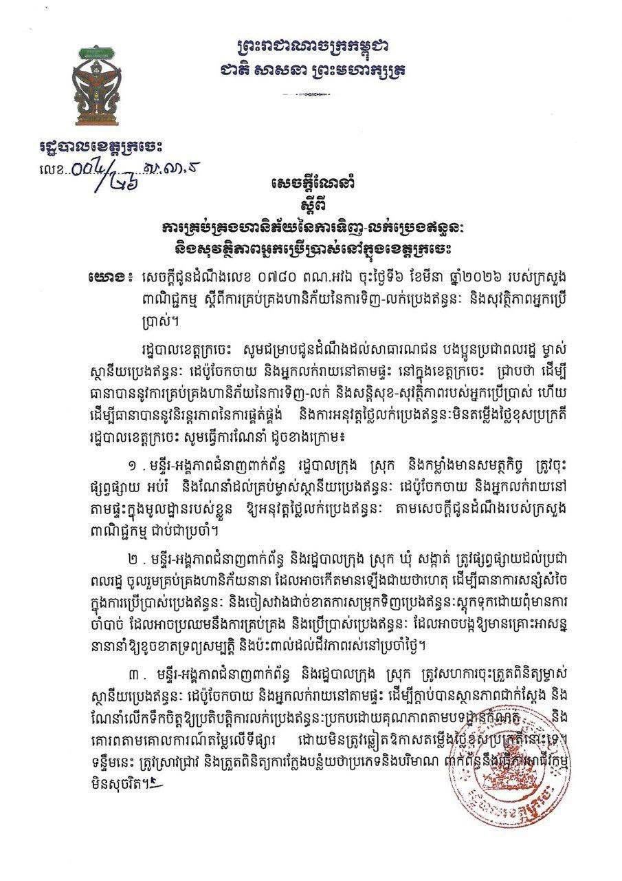 រដ្ឋបាលខេត្តក្រចេះ ចេញសេចក្តីណែនាំ ស្តីពី ការគ្រប់គ្រងហានិភ័យនៃការទិញលក់ប្រេងឥន្ទនៈ និងសុវត្ថិភាពអ្នកប្រើប្រាស់ ក្នុងភូមិសាស្ដ្រខេត្តក្រចេះ