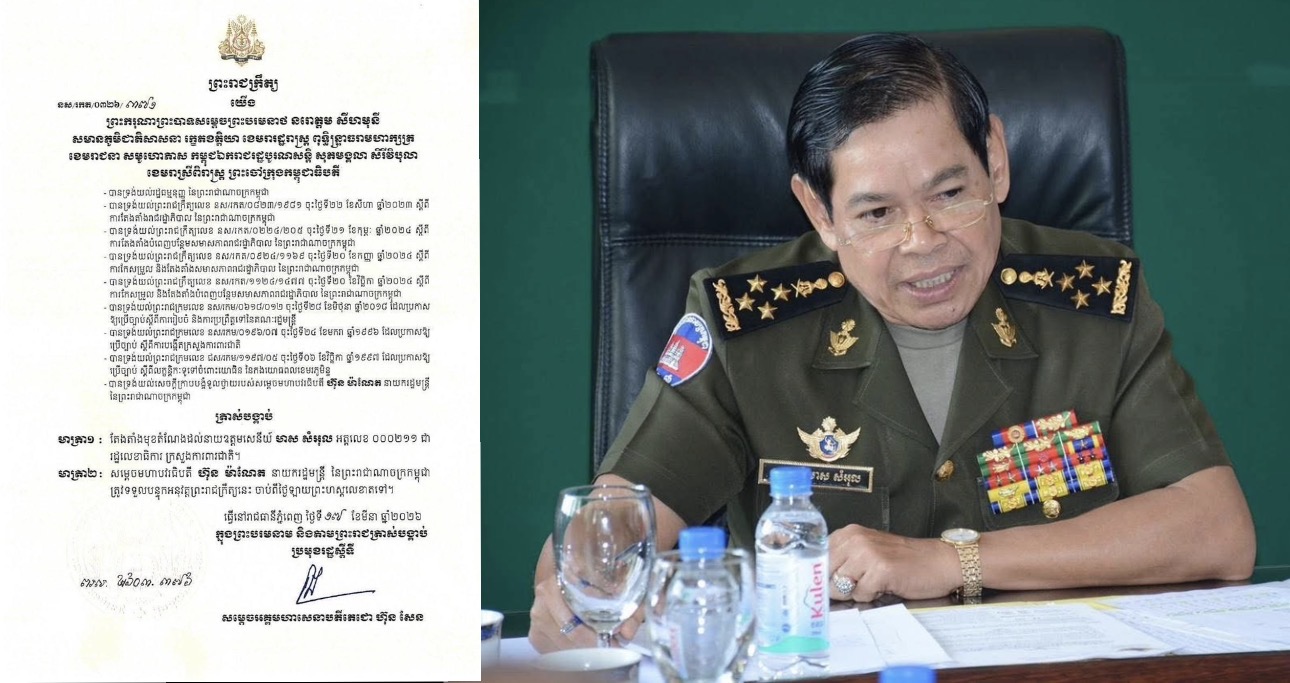 ភ្នំពេញ៖ ប្រមុខរដ្ឋស្តីទី សម្តេចតេជោ ហ៊ុន សែន នៅថ្ងៃទី១៧ ខែមីនា ឆ្នាំ២០២៦នេះ បានចេញព្រះរាជក្រឹត្យតែងតាំងនាយឧត្តមសេនីយ៍ មាស សំអុល ជារដ្ឋលេខាធិការក្រសួងការពារជាតិ។ នេះបើតាមព្រះរាជក្រឹត្យដែលបណ្តាញព័ត៌មាន “អែស អរ អិន ” ទទួលបាន។