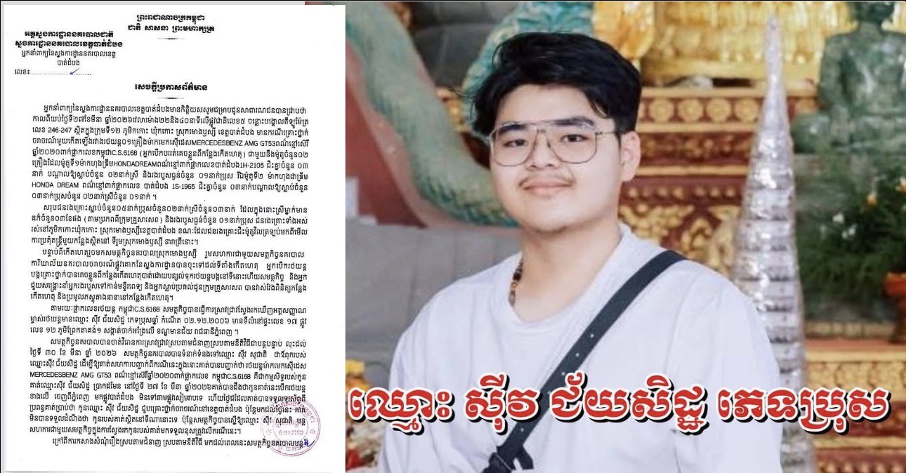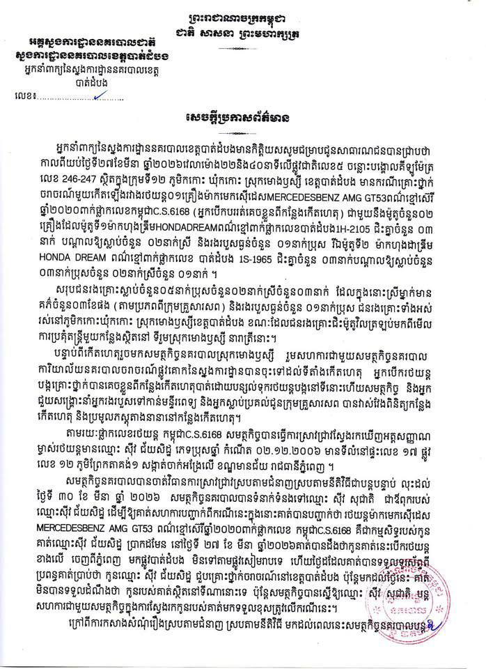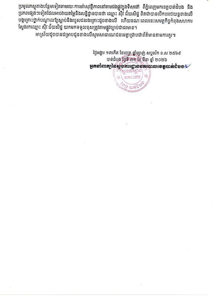 អ្នកនាំពាក្យ​នៃ​ស្នងការដ្ឋាន​នគរបាល​ខេត្ត​បាត់ដំបង​ ចេញ​សេចក្តីប្រកាសព័ត៌មានស្តីពីលទ្ធផលនៃការស្រាវ​ជ្រាវស៊េីបអង្កេតលេីករណីគ្រោះថ្នាក់ចរាចរណ៍នៅផ្លូវជាតិលេខ​៥​ នៅស្រុកមោងឫស្សី​ ខេត្តបាត់​ដំបង