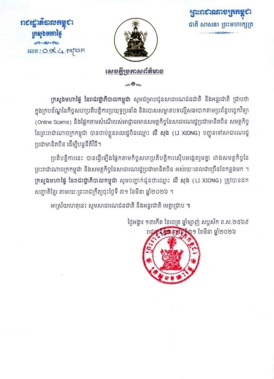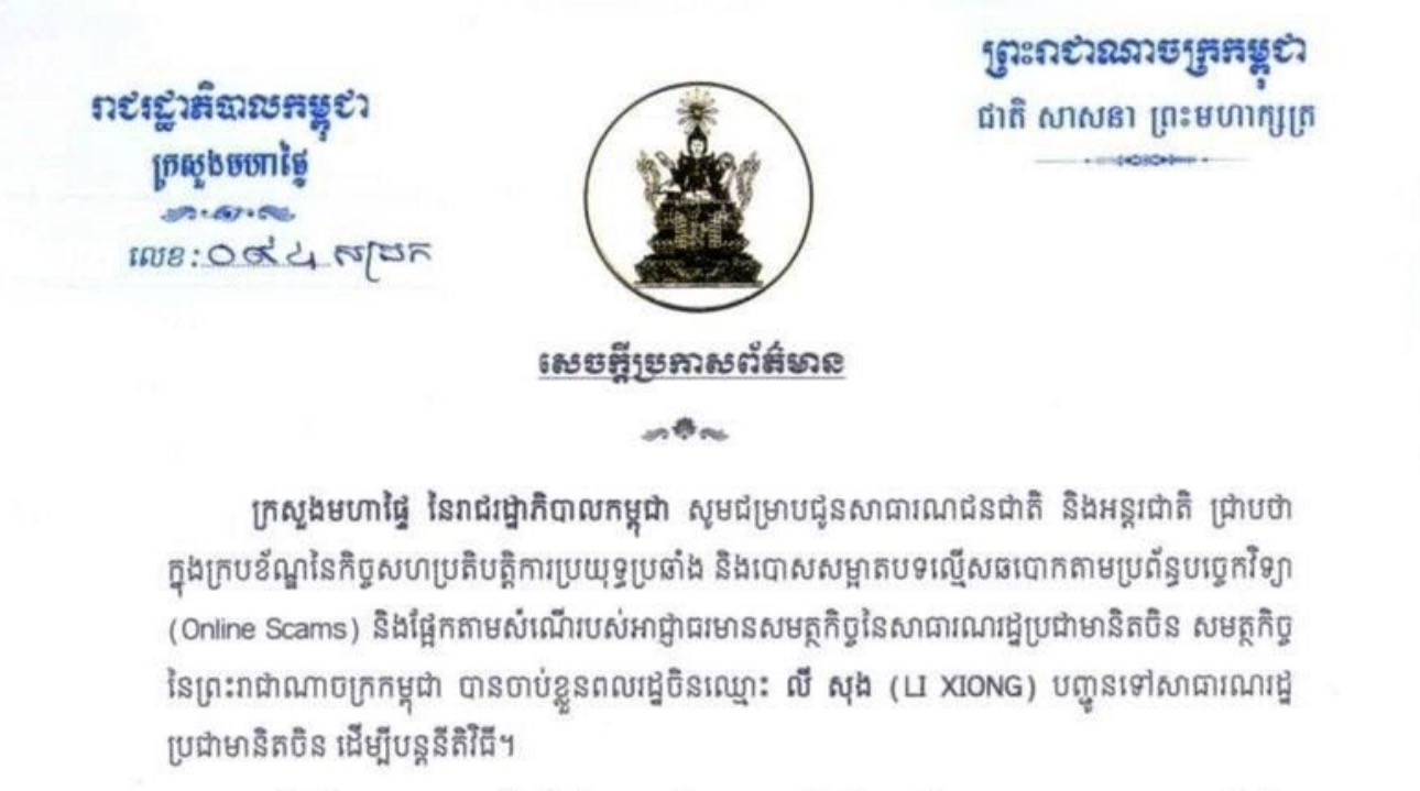 ក្រសួងមហាផ្ទៃ នៃរាជរដ្ឋាភិបាលកម្ពុជា ជូនដំណឹងដល់សាធារណជនជាតិ និងអន្តរជាតិ ជ្រាបថា ក្នុងក្របខ័ណ្ឌនៃកិច្ចសហការប្រយុទ្ធប្រឆាំង និងបោសសម្អាតបទល្មើសឆបោកតាមប្រព័ន្ធបច្ចេកវិទ្យា (Online Scams) និងផ្អែកតាមសំណើរបស់អាជ្ញាធរមានសមត្ថកិច្ច នៃសាធារណរដ្ឋប្រជាមានិតចិន សមត្ថកិច្ចនៃព្រះរាជាណាចក្រកម្ពុជា បានចាប់ខ្លួនពលរដ្ឋចិន ឈ្មោះ លី សុង (LI XIONG) បញ្ជូនទៅសាធារណរដ្ឋប្រជាមានិតចិន ដើម្បីបន្តនីតិវិធី។