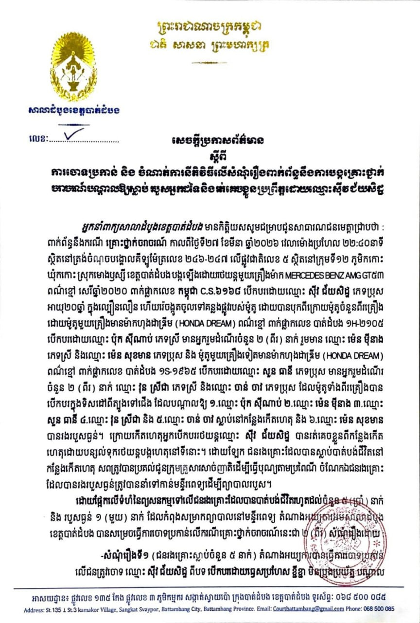 Home » តុលាការខេត្តបាត់ដំបង សម្រេចឃុំខ្លួន ស៊ីវ ជ័យសិដ្ឋ ដែលបើករថយន្តបង្កគ្រោះថ្នាក់ចរាចរណ៍បុកស្លាប់មនុស្ស ៦នាក់ នៅស្រុកមោងឫស្សី