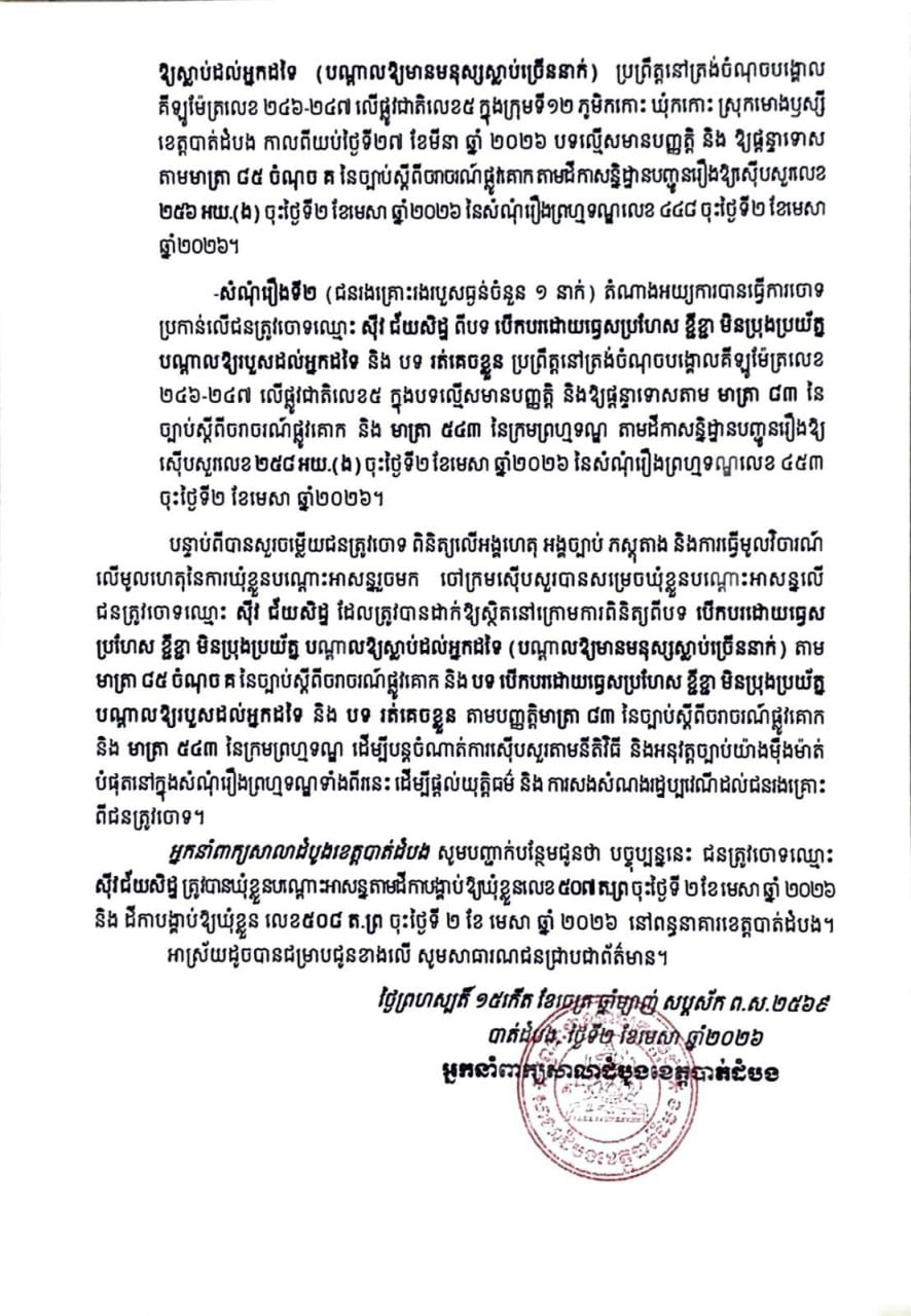 តុលាការខេត្តបាត់ដំបង សម្រេចឃុំខ្លួន ស៊ីវ ជ័យសិដ្ឋ ដែលបើករថយន្តបង្កគ្រោះថ្នាក់ចរាចរណ៍បុកស្លាប់មនុស្ស ៦នាក់ នៅស្រុកមោងឫស្សី
