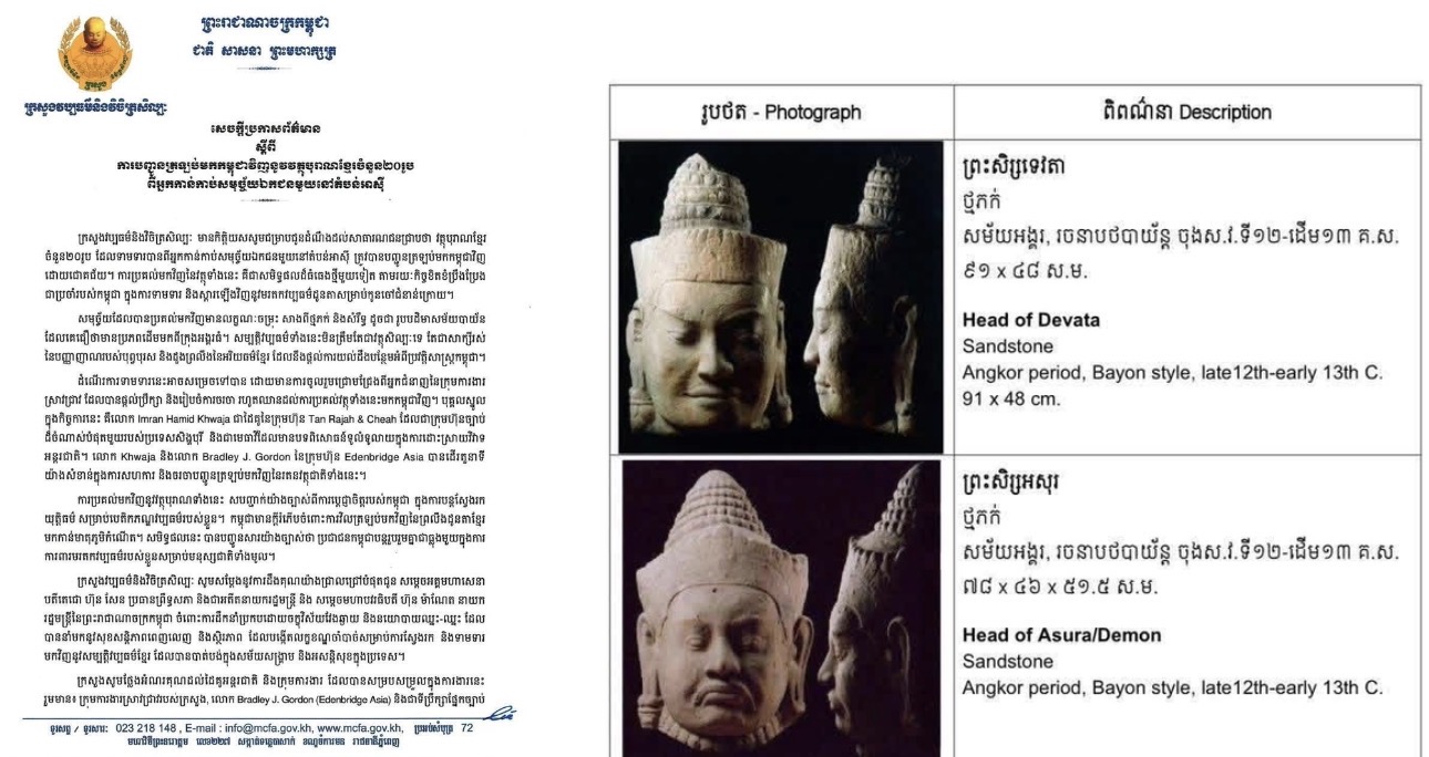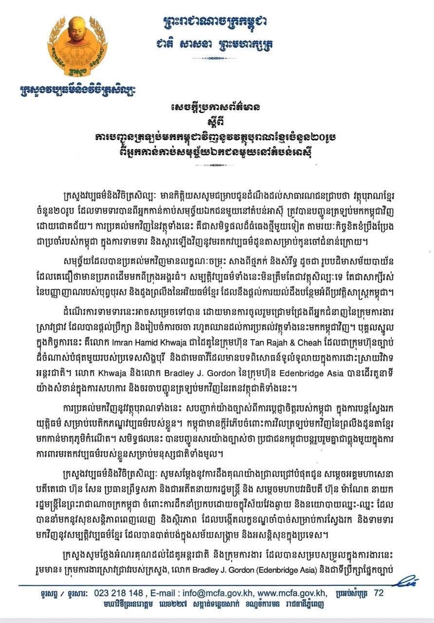 ព្រលឹងដូនតាខ្មែរបានវិលមកមាតុប្រទេសវិញហើយ! កម្ពុជាមាតុភូនិវត្ត វត្ថុបុរាណខ្មែរ ២០រូប ដោយជោគជ័យ ពីអ្នកកាន់កាប់សមុច្ច័យឯកជនមួយនៅតំបន់អាស៉ី