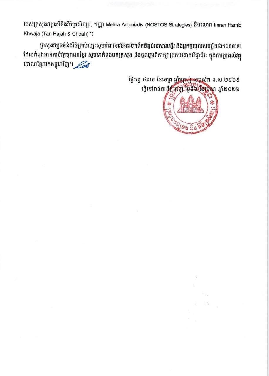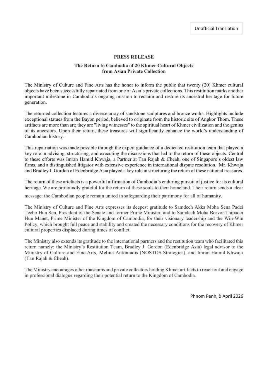 (ភ្នំពេញ)៖ ក្រសួងវប្បធម៌និងវិចិត្រសិល្បៈ នៅថ្ងៃទី៧ ខែមេសា ឆ្នាំ២០២៦ បានជូនដំណឹងថា វត្ថុបុរាណខ្មែរចំនួន២០រូប ដែលទាមទារបានពីអ្នកកាន់កាប់សមុច្ច័យឯកជនមួយនៅតំបន់អាស៊ី ត្រូវបានបញ្ជូនត្រឡប់មកកម្ពុជាវិញដោយជោគជ័យ។ ការប្រគល់មកវិញនៃវត្ថុទាំងនេះ គឺជាសមិទ្ធផលដ៏ធំធេងថ្មីមួយទៀតតាមរយៈកិច្ចខិតខំប្រឹងប្រែងជាប្រចាំរបស់កម្ពុជា ក្នុងការទាមទារ និងស្តារឡើងវិញនូវមរតកវប្បធម៌ដូនតាសម្រាប់កូនចៅជំនាន់ក្រោយ៕