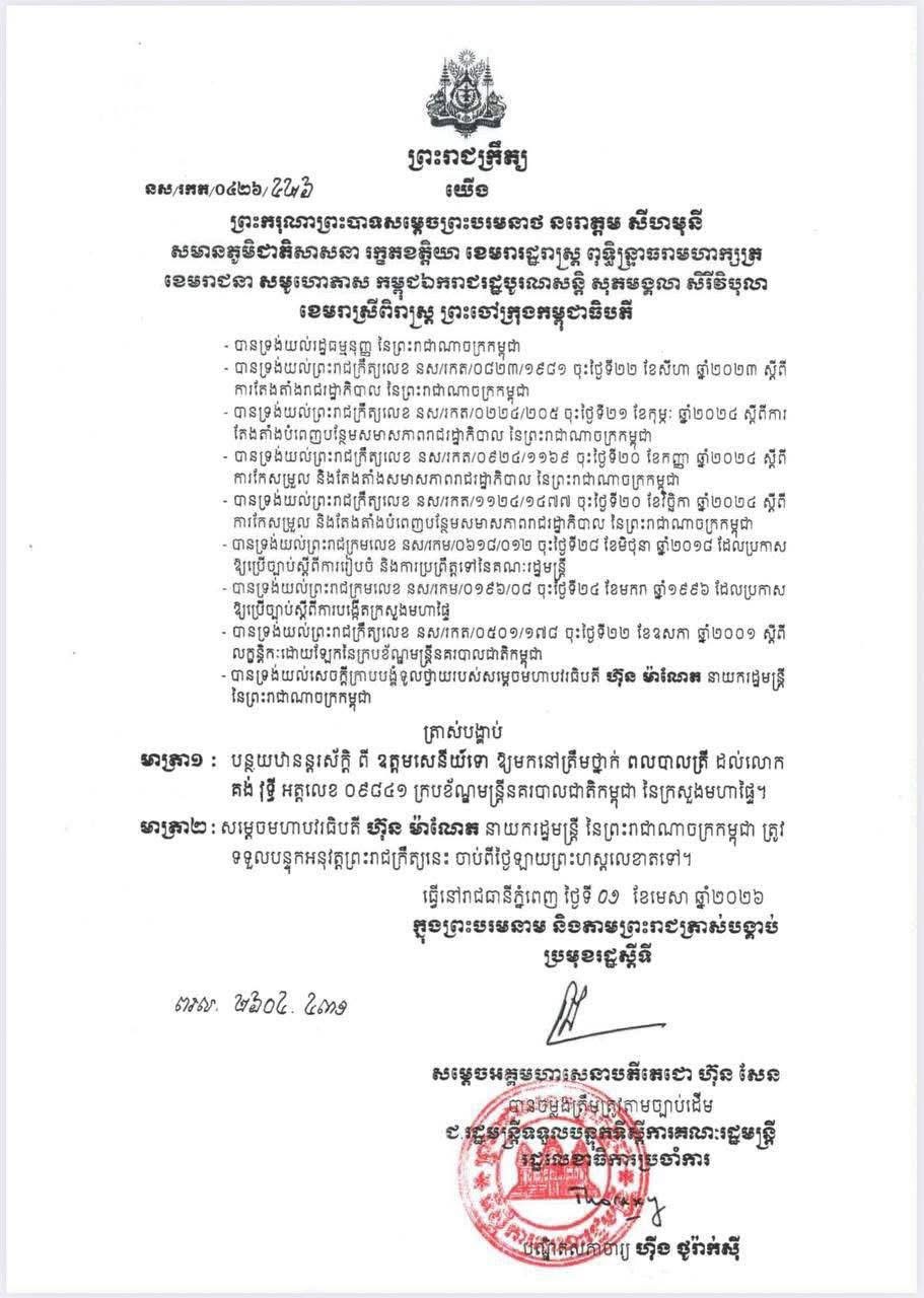 លោក គង់ វុទ្ធី ត្រូវបានបន្ថយឋានន្ដរស័ក្ដិ ពីឧត្ដមសេនីយ៍ទោមកនៅត្រឹមពលបាលត្រី។ នេះបើតាមព្រះរាជ្យក្រឹត្យចុះហត្ថលេខានៅថ្ងៃទី១ ខែមេសា ឆ្នាំ២០២៦ ដែលទើបចេញផ្សាយនៅថ្ងៃនេះ។ កន្លងមកលោក គង់ វុទ្ធី រងការចោទប្រកាន់ថាយកលុយ២លានដុល្លារជាថ្នូរនឹងការរត់ការឱ្យជនបរទេស ប៉ុន្ដែមិនបានលទ្ធផលហើយមិនព្រមប្រគល់លុយត្រឡប់ទៅវិញ។ គួរឱ្យដឹងថា លោក គង់ វុទ្ធី ជាអគ្គនាយករង នៃអគ្គនាយកដ្ឋានអត្តសញ្ញាណកម្ម ក្រសួងមហាផ្ទៃ៕