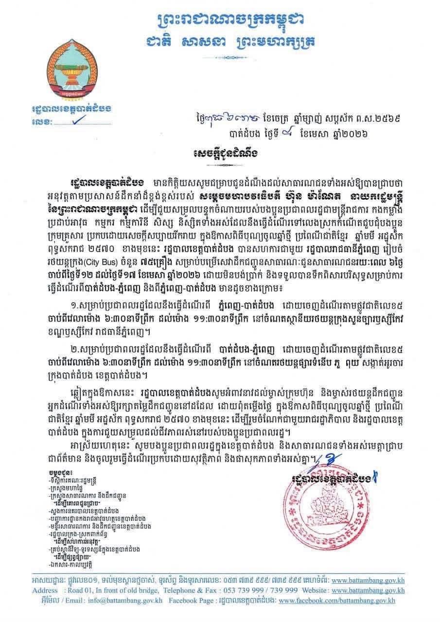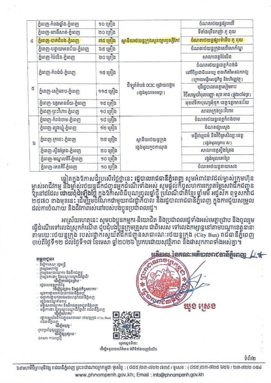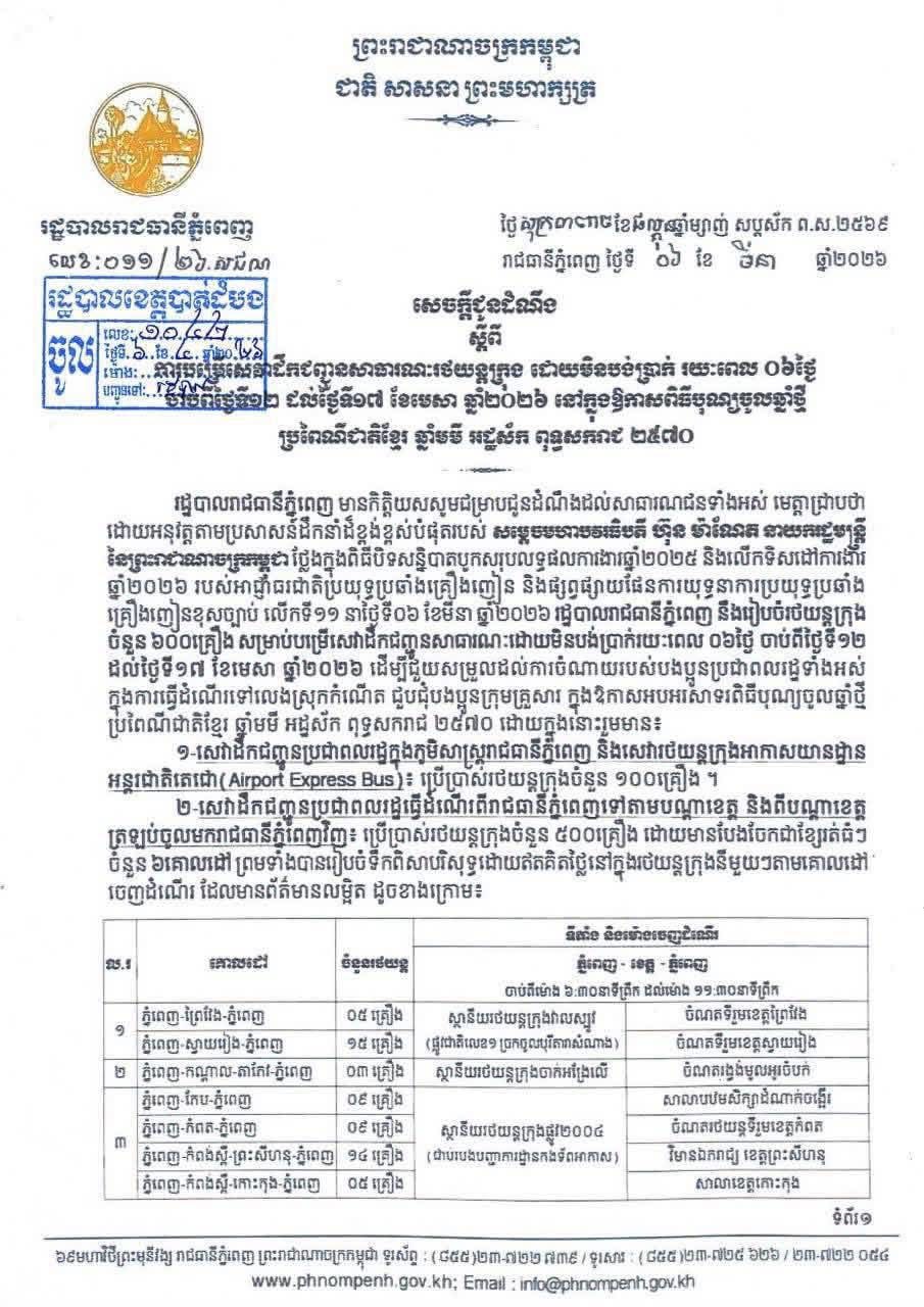 សេចក្តីជូនដំណឹង ស្តីពី ការបម្រើសេវាដឹកជញ្ជូនសាធារណៈរថយន្តក្រុង ដោយមិនបង់ប្រាក់ រយៈពេល ០៦ថ្ងៃ ចាប់ពីថ្ងៃទី១២ ដល់ថ្ងៃទី១៧ ខែមេសា ឆ្នាំ២០២៦ នៅក្នុងឱកាសពិធីបុណ្យចូលឆ្នាំថ្មី ប្រពៃណីជាតិខ្មែរ