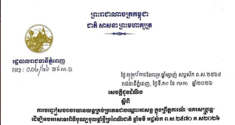ភ្នំពេញ៖ ដើម្បីចូលរួមអបអរសាទរ ក្នុងឱកាសពិធីបុណ្យចូលឆ្នាំថ្មី ប្រពៃណីជាតិ ឆ្នាំមមី អដ្ឋស័ក ព.ស.២៥៧០ គ.ស២០២៦ រដ្ឋបាលរាជធានីភ្នំពេញ សហការជាមួយសហភាពសហព័ន្ធយុវជនកម្ពុជា នឹងរៀបចំព្រឹត្តការណ៍ «នគរសង្ក្រាន្ត» ចំនួន ៦ទីតាំង រួមមាននៅរមណីយដ្ឋានវប្បធម៌ប្រវត្តិសាស្ត្រវត្តភ្នំ, សួនវឌ្ឍនៈ, ផ្លូវថ្មើរជើងចតុមុខ (Walk Street), ផ្សារទួលទំពូង, បាសាក់លែន និងសួនច្បារមុខវត្តបុទុមវតី ដែលមានរយៈពេល៦ថ្ងៃ ចាប់ពីថ្ងៃទី១៤ ដល់ថ្ងៃទី១៩ ខែមេសា ឆ្នាំ២០២៦ ដោយមានរៀបចំកម្មវិធីបែបប្រពៃណីជាតិ និងកម្សាន្តសប្បាយជាច្រើន ដូចជា កម្មវិធីទទួលទេវតាឆ្នាំថ្មី ដង្ហែព្រះពុទ្ធរូប ពូនភ្នំខ្សាច់ ស្រង់ព្រះ សម្តែងសិល្បៈ របាំប្រពៃណី របាំបុរាណ ល្បែងប្រជាប្រិយជាតិ (ទាញព្រ័ត្រ បោះអង្គញ់ វាយក្អម ចោលឈូង លាក់កន្សែង ចាប់កូនខ្លែង និងដណ្តើម ស្លឹកឈើ) ប្រគំតន្ត្រីបុរាណ-សម័យ រាំលេងកម្សាន្ត តាំងបង្ហាញគំនូរបុរាណ និងវត្ថុសិល្បៈវប្បធម៌។