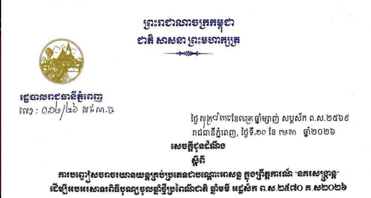 ខាងក្រោមនេះ ជាសេចក្ដីជូនដំណឹងរបស់រដ្ឋបាលរាជធានីភ្នំពេញ៖