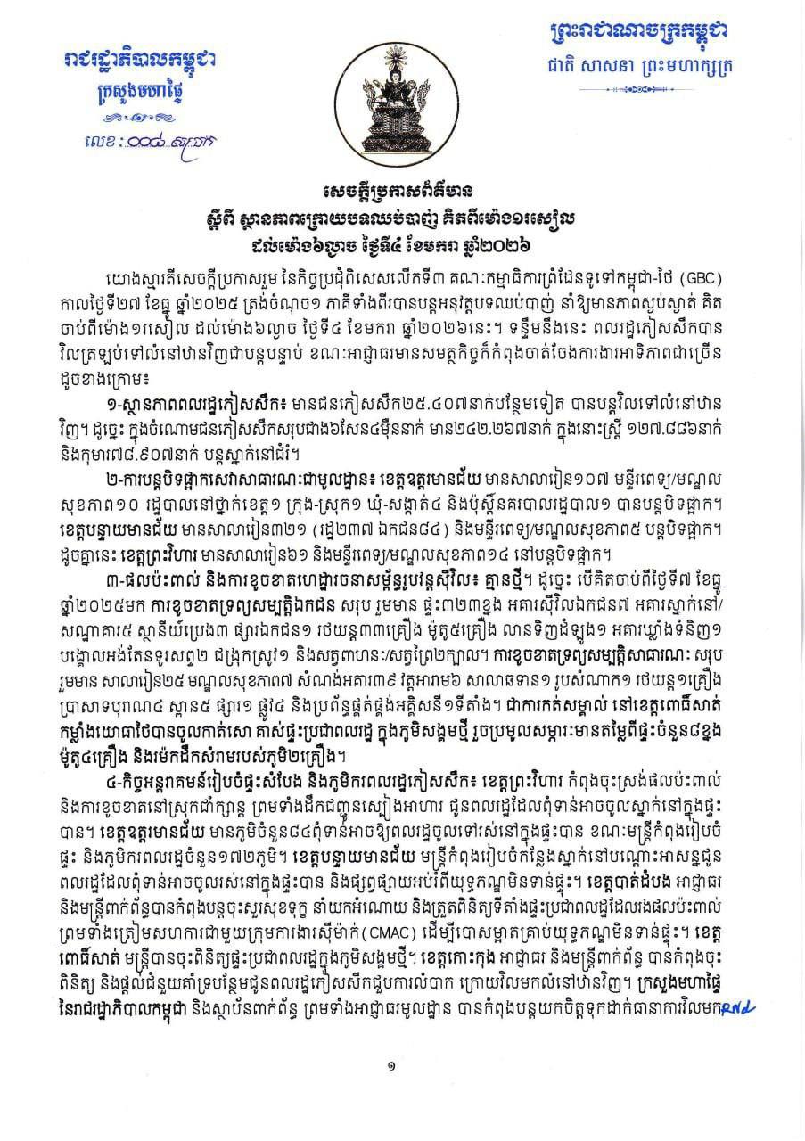 ក្រសួងមហាផ្ទៃ ៖ គិតពីម៉ោង ១រសៀល ដល់ម៉ោង ៦ល្ងាច ថ្ងៃទី៤ ខែមករា ឆ្នាំ២០១៦នេះ មានជនភៀសសឹក ២៥.៤០៧នាក់បន្ថែមទៀត បាន បន្ត វិលទៅលំនៅឋានវិញ