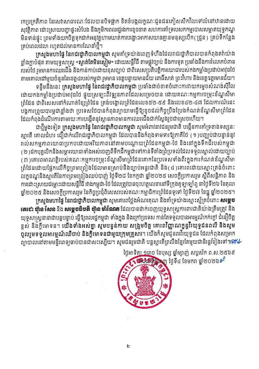 • សេចក្តីប្រកាសព័ត៌មាន កម្ពុជា តវ៉ាយ៉ាងដាច់អហង្ការចំពោះ​សកម្មភាព ខុសច្បាប់របស់ថៃដែលកាន់កាប់ដោយខុសច្បាប់នៅ​តំបន់ព្រំដែនកម្ពុជា