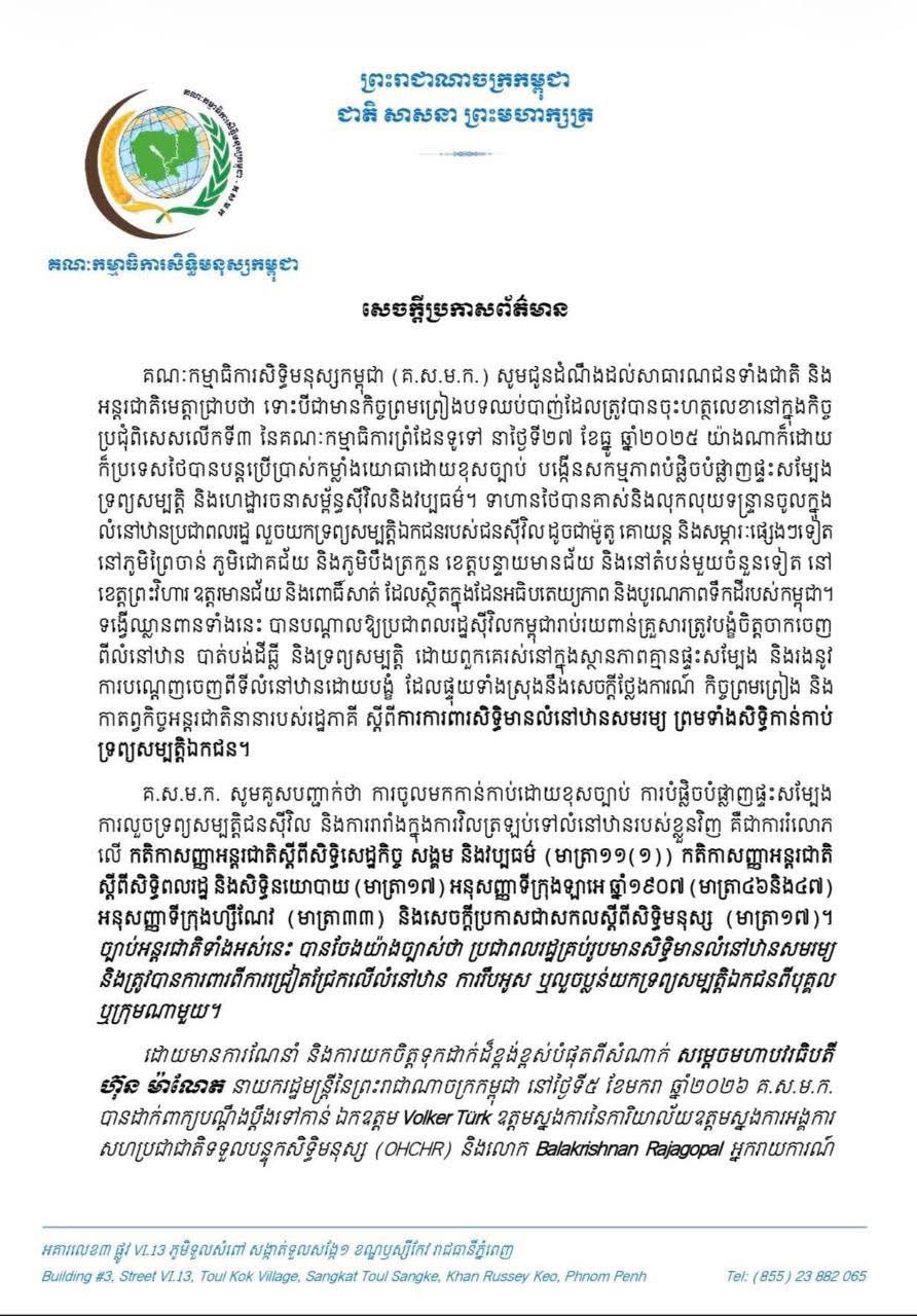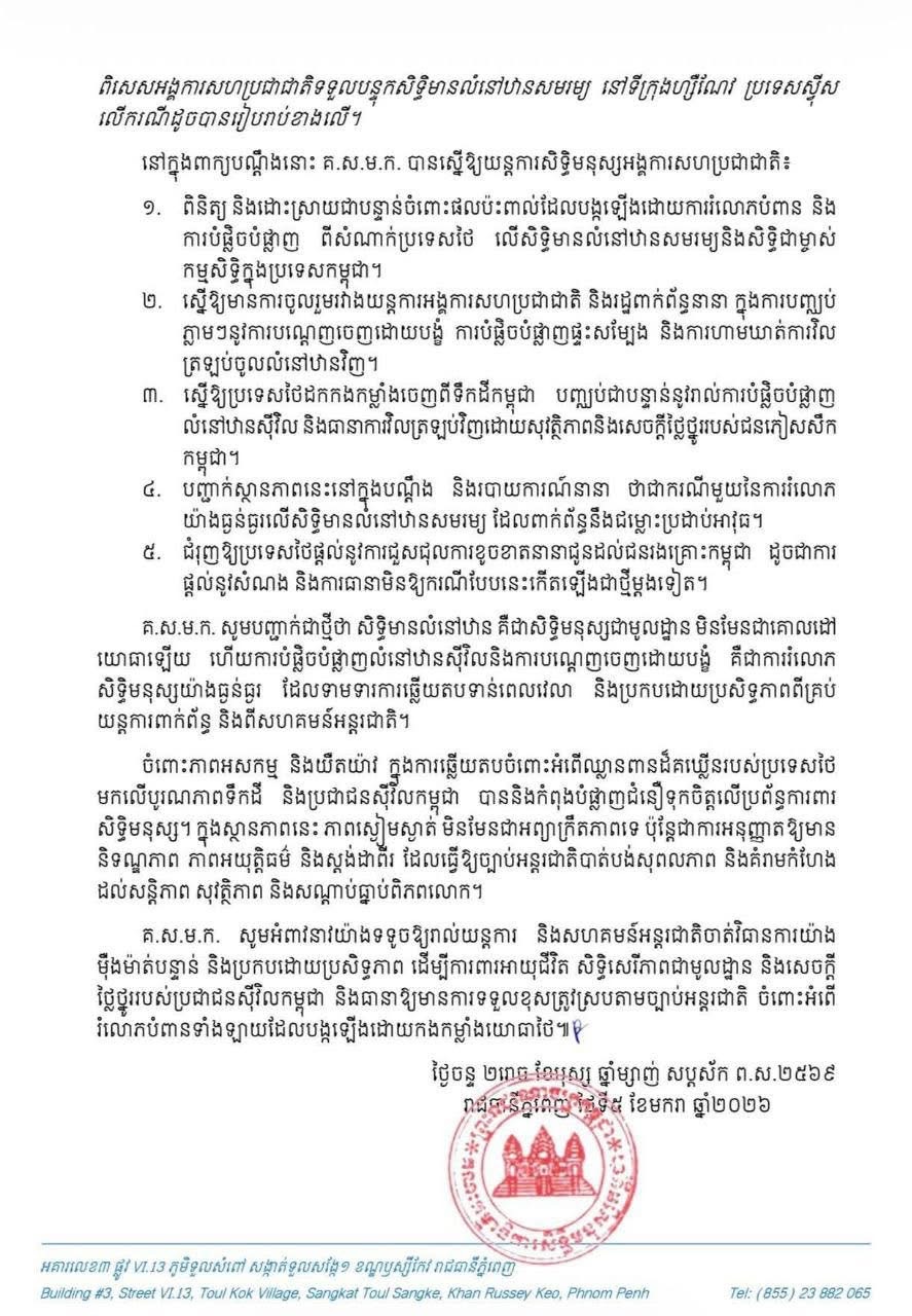 គណៈកម្មាធិការសិទ្ធិមនុស្សកម្ពុជា (គ.ស.ម.ក.) បានដាក់ពាក្យបណ្តឹង ទៅកាន់យន្តការសិទ្ធិមនុស្សនៃអង្គការសហប្រជាជាតិ ទាមទារឱ្យចាត់វិធានការយ៉ាងឆាប់រហ័ស និងម៉ឺងម៉ាត់ ចំពោះការរំលោភសិទ្ធិមានលំនៅឋាន និងសិទ្ធិកាន់កាប់ទ្រព្យសម្បត្តិឯកជនរបស់ប្រជាពលរដ្ឋកម្ពុជា
