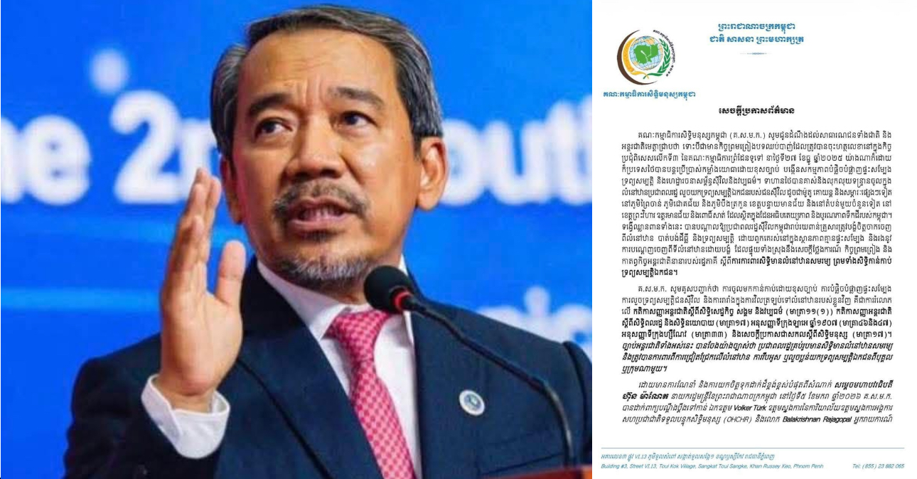 Home » គណៈកម្មាធិការសិទ្ធិមនុស្សកម្ពុជា (គ.ស.ម.ក.) បានដាក់ពាក្យបណ្តឹង ទៅកាន់យន្តការសិទ្ធិមនុស្សនៃអង្គការសហប្រជាជាតិ ទាមទារឱ្យចាត់វិធានការយ៉ាងឆាប់រហ័ស និងម៉ឺងម៉ាត់ ចំពោះការរំលោភសិទ្ធិមានលំនៅឋាន និងសិទ្ធិកាន់កាប់ទ្រព្យសម្បត្តិឯកជនរបស់ប្រជាពលរដ្ឋកម្ពុជា
