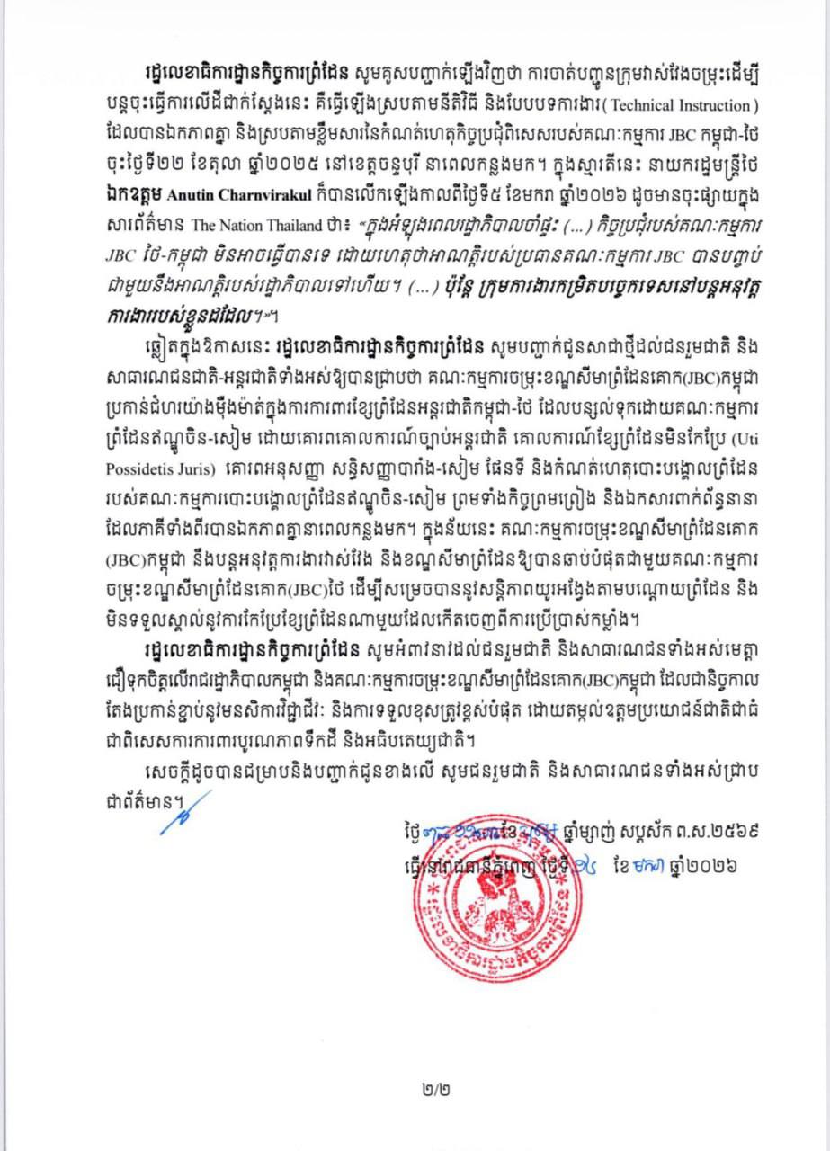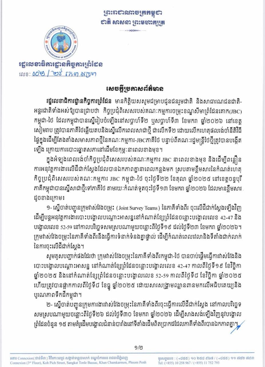 ភាគីថៃស្នើលើកពេលសាជាថ្មី ជាលើកទី២ ដោយមិនបានចូលរួមកិច្ចប្រជុំពិសេសរបស់គណៈកម្មការចម្រុះខណ្ឌសីមាព្រំដែនគោក(JBC) កម្ពុជា-ថៃ ដែលកម្ពុជាបានស្នើរៀបចំឡើងនៅសប្តាហ៍ទី២ ឬសប្តាហ៍ទី៣ ខែមករា ឆ្នាំ២០២៦ នៅខេត្តសៀមរាប