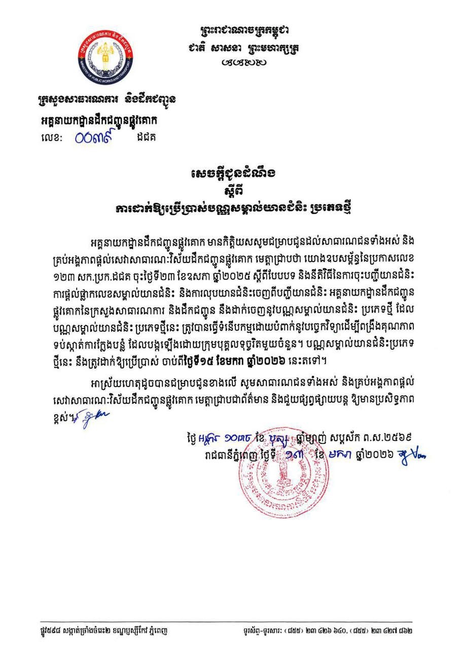 ដូចក្នុងសេចក្តីប្រកាសការចេញបណ្ណសម្គាល់ថ្មី គឺសម្រាប់ការចុះបញ្ជីយានជំនិះថ្មី ដោយចាប់អនុវត្តពីថ្ងៃទី១៥ ខែមករា ឆ្នាំ២០២៦ តទៅ។ ចំពោះបណ្ណចាស់បងប្អូននៅបន្តប្រើប្រាស់បានធម្មតា។ ក្នុងករណីបងប្អូនប្រជាពលរដ្ឋចង់បានបណ្ណប្រភេទថ្មី បងប្អុនអាចដាក់ពាក្យស្នើសុំប្តូរនៅតាមទីតាំងផ្តល់សេវាសាធារណៈរបស់ក្រសួងសាធារណការ និងដឹកជញ្ជូនរៀងរាល់ម៉ោងបំពេញការងារ។សូមអរគុណ