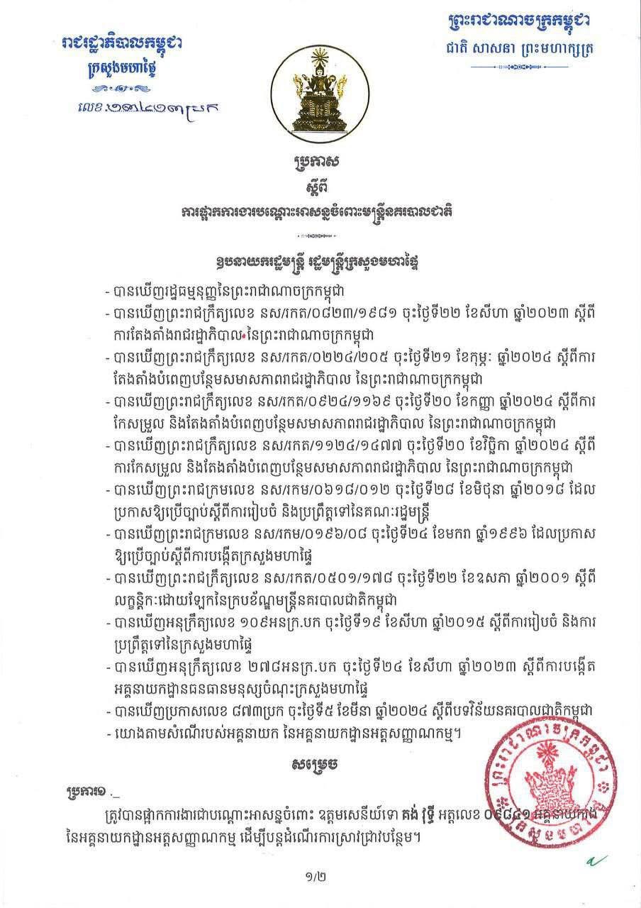 នេះបើយោងតាមប្រកាសរបស់រដ្ឋមន្ត្រីក្រសួងមហាផ្ទៃ កាលពីថ្ងៃទី៩ ខែធ្នូ ឆ្នាំ២០២៥ កន្លងទៅ ដែលអង្គភាពសារព័ត៌មាន កម្ពុជាឈ្នះ ទើបតែទទួលបាននៅរសៀលថ្ងៃទី២១ ខែមករា ឆ្នាំ២០២៦ នេះ ។