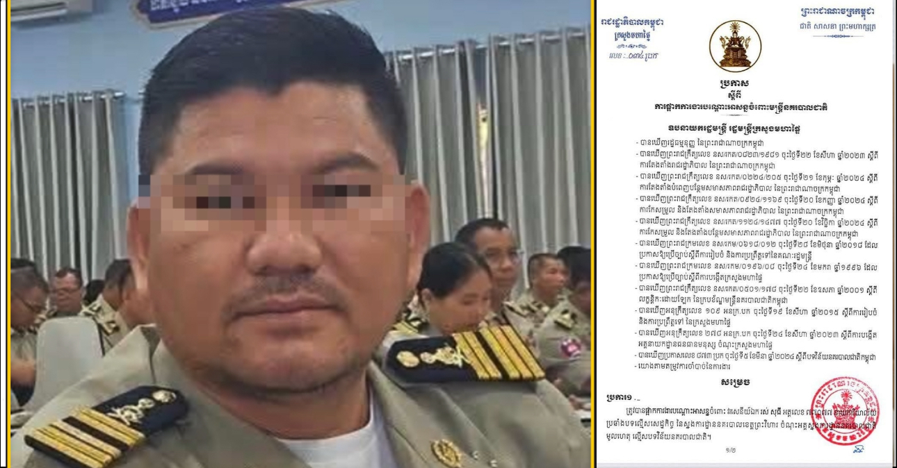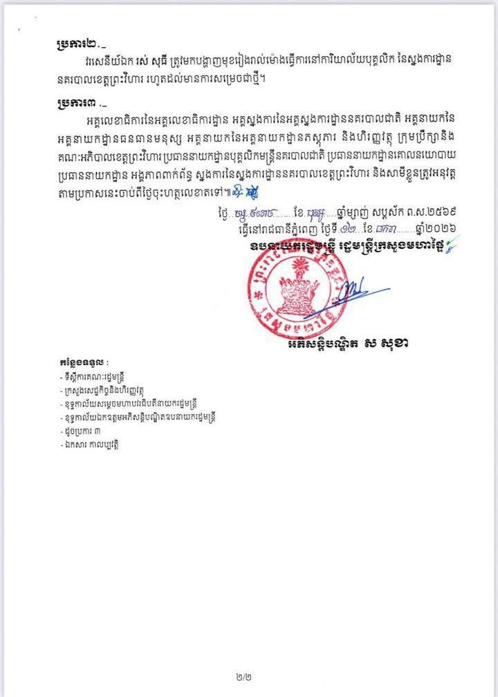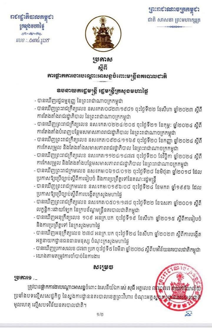 ឯកឧត្ដមអភិសន្តិបណ្ឌិត ស សុខា ឧបនាយករដ្ឋមន្ត្រី រដ្ឋមន្ត្រីក្រសួងមហាផ្ទៃ ចេញប្រកាសផ្អាកការងារជាបណ្តោះអាសន្នចំពោះលោកវរៈសេនីយ៍ឯក រស់ សុធី នាយការិយាល័យប្រឆាំងបទល្មើសសេដ្ឋកិច្ច នៃស្នងការដ្ឋាននគរបាលខេត្តព្រះវិហារ មូលហេតុ ល្មេីសវិន័យកងកម្លាំងនគរបាលជាតិ ។