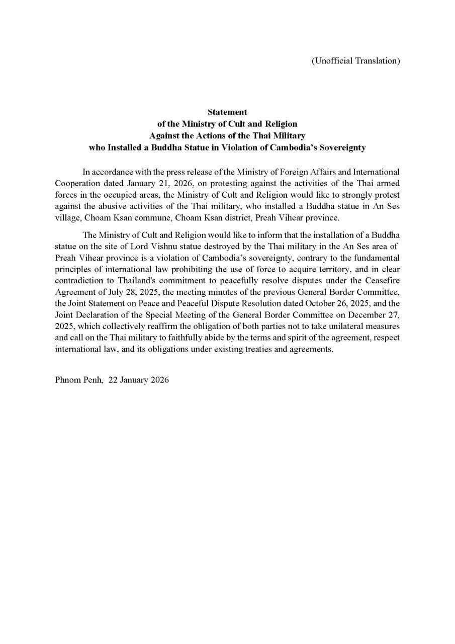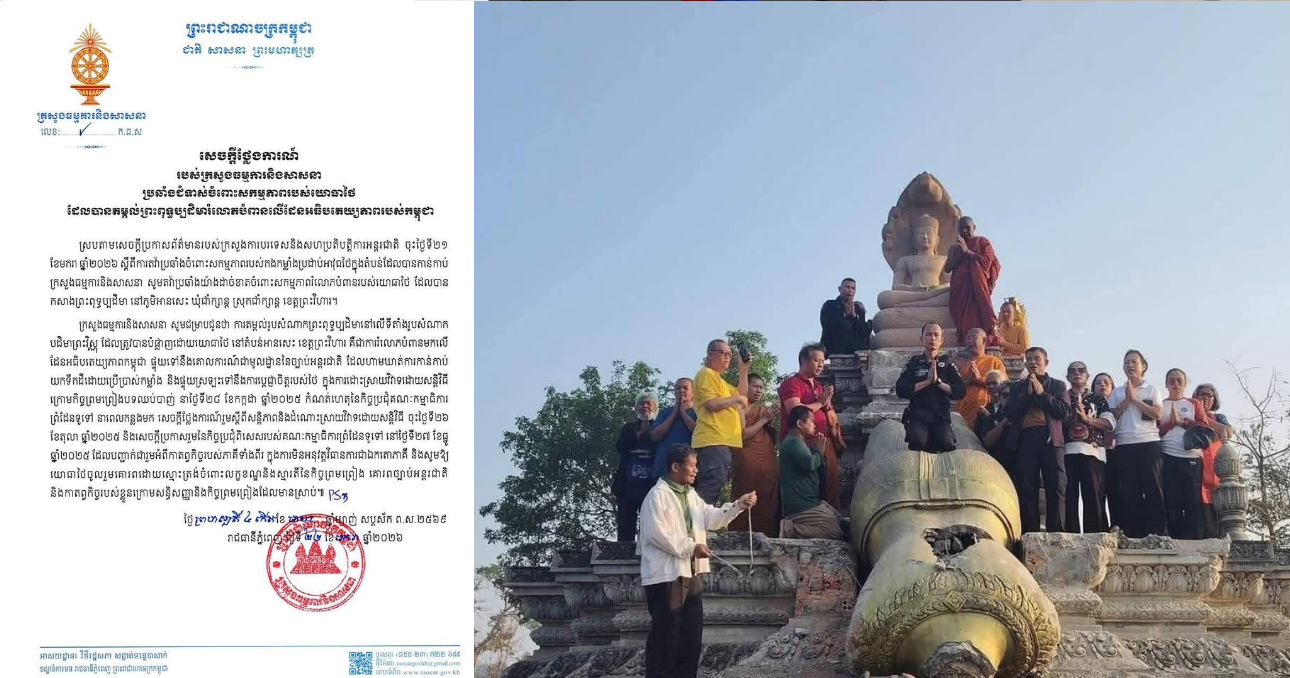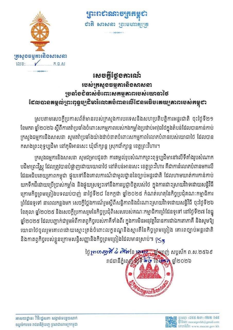 ក្រសួងធម្មការ និងសាសនា ចេញសេចក្តីថ្លែងការណ៍ប្រឆាំងជំទាស់ចំពោះសកម្មភាពរបស់យោធាថៃ ដែលបានតម្កល់ព្រះពុទ្ធប្បដិមារំលោភបំពាន លើដែនអធិបតេយ្យភាពរបស់កម្ពុជា
