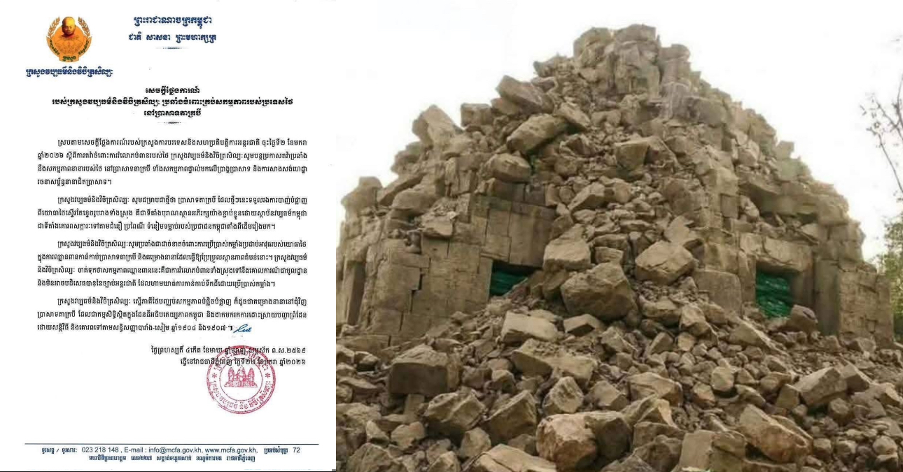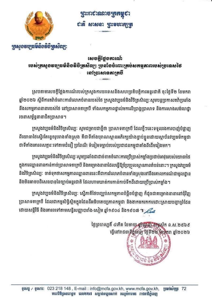 ស្របតាមសេចក្តីថ្លែងការណ៍ របស់ក្រសួងការបរទេស និងសហប្រតិបត្តិការអន្តរជាតិ ចុះថ្ងៃទី២ ខែមករា ឆ្នាំ២០២៦ ស្តីពីការតវ៉ាចំពោះការរំលោភបំពានរបស់ថៃ ក្រសួង វប្បធម៌និងវិចិត្រសិល្បៈនៃព្រះរាជាណាចក្រកម្ពុជា សូមបន្តប្រកាសតវ៉ាប្រឆាំង នឹងសកម្មភាពនានារបស់ថៃ នៅប្រាសាទតាក្របី ទាំងសកម្មភាពផ្ទាល់មកលើប្រាង្គប្រាសាទ និងការសាងសង់ហេដ្ឋា រចនាសម្ព័ន្ធនានាជិតប្រាសាទ។