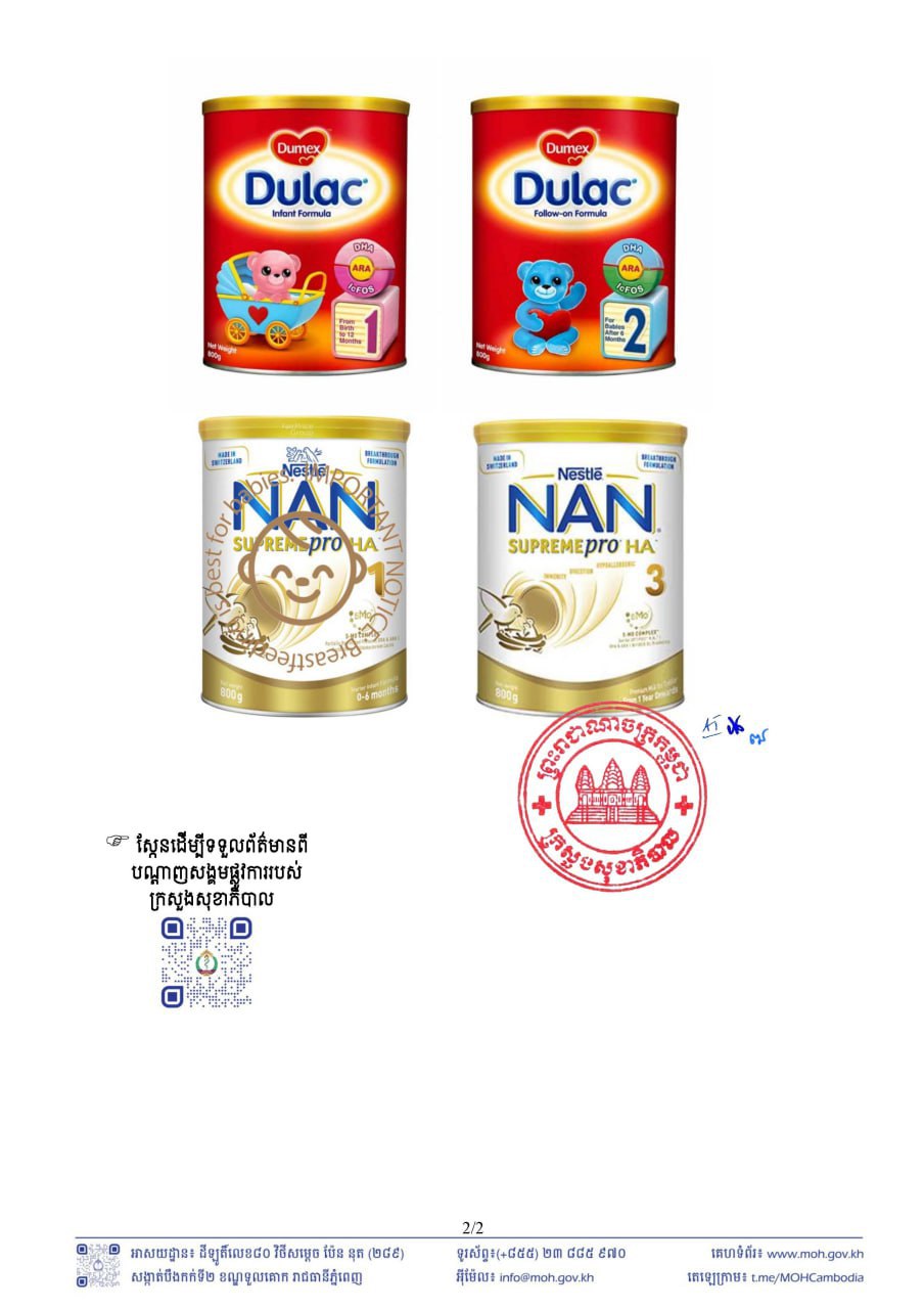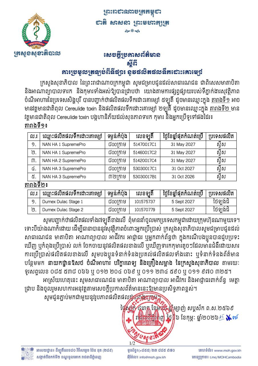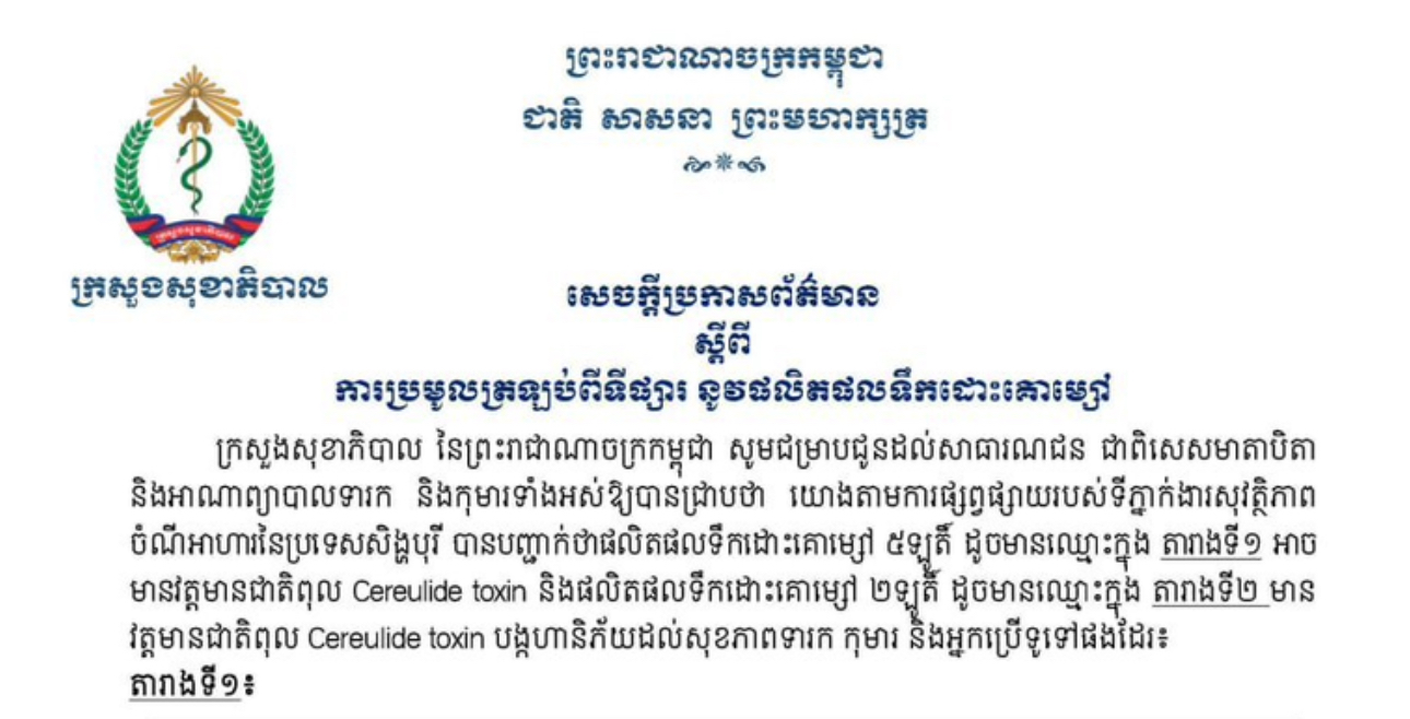 ក្រសួងសុខាភិបាល ចេញសេចក្តីប្រកាសព័ត៌មាន ស្តីពីការប្រមូលត្រឡប់ពីទីផ្សារ នូវផលិតផលទឹកដោះគោម្សៅ