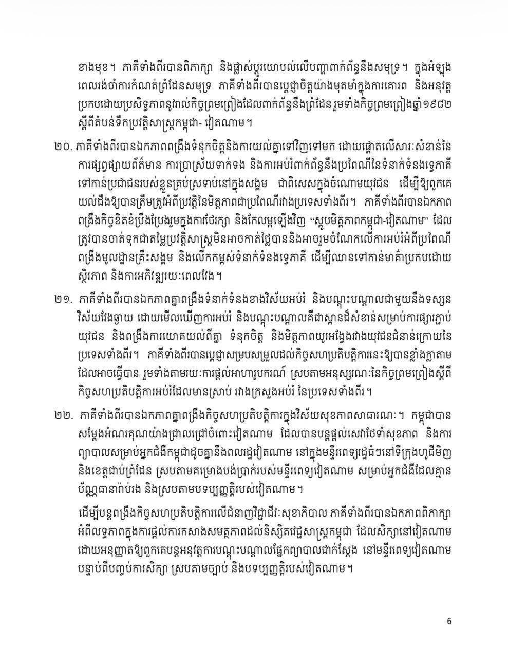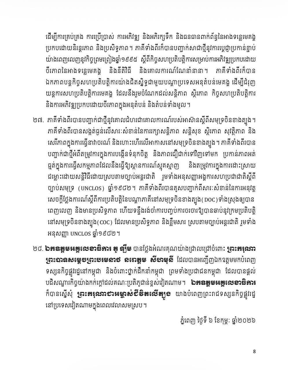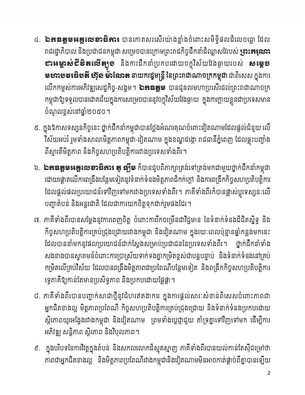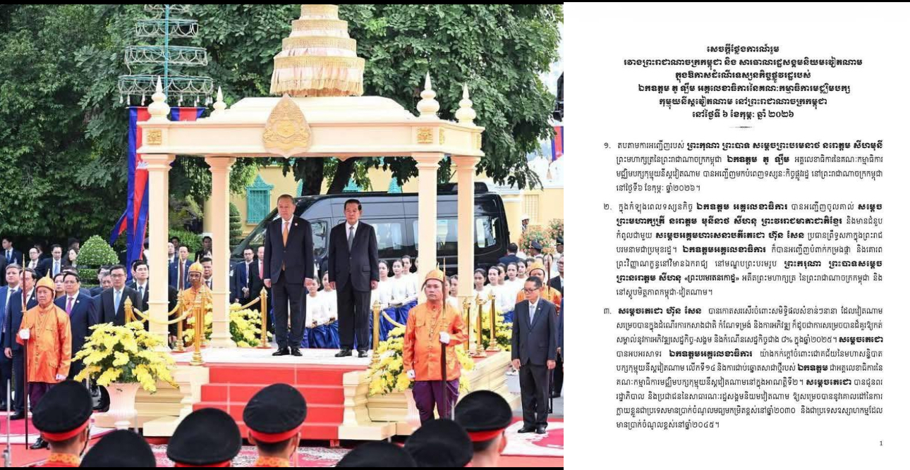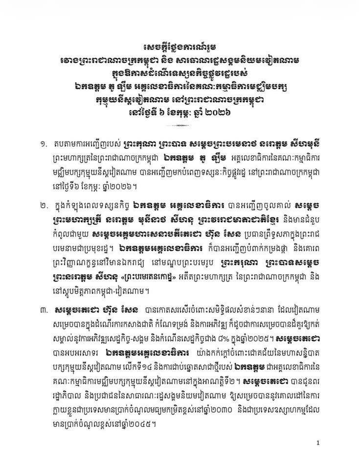 Share Facebook Twitter LinkedIn Pinterest Email សេចក្តីថ្លែងការណ៍រួម រវាងព្រះរាជាណាចក្រកម្ពុជា និង សាធារណរដ្ឋសង្គមនិយមវៀតណាម ក្នុងឱកាសដំណើរទស្សនកិច្ចផ្លូវរដ្ឋរបស់ ឯកឧត្តម តូ ឡឹម អគ្គលេខាធិការនៃគណៈកម្មាធិការមជ្ឈិមបក្សកុម្មុយនីស្តវៀតណាម នៅព្រះរាជាណាចក្រកម្ពុជា នៅថ្ងៃទី ៦ ខែកុម្ភៈ ឆ្នាំ ២០២៦។