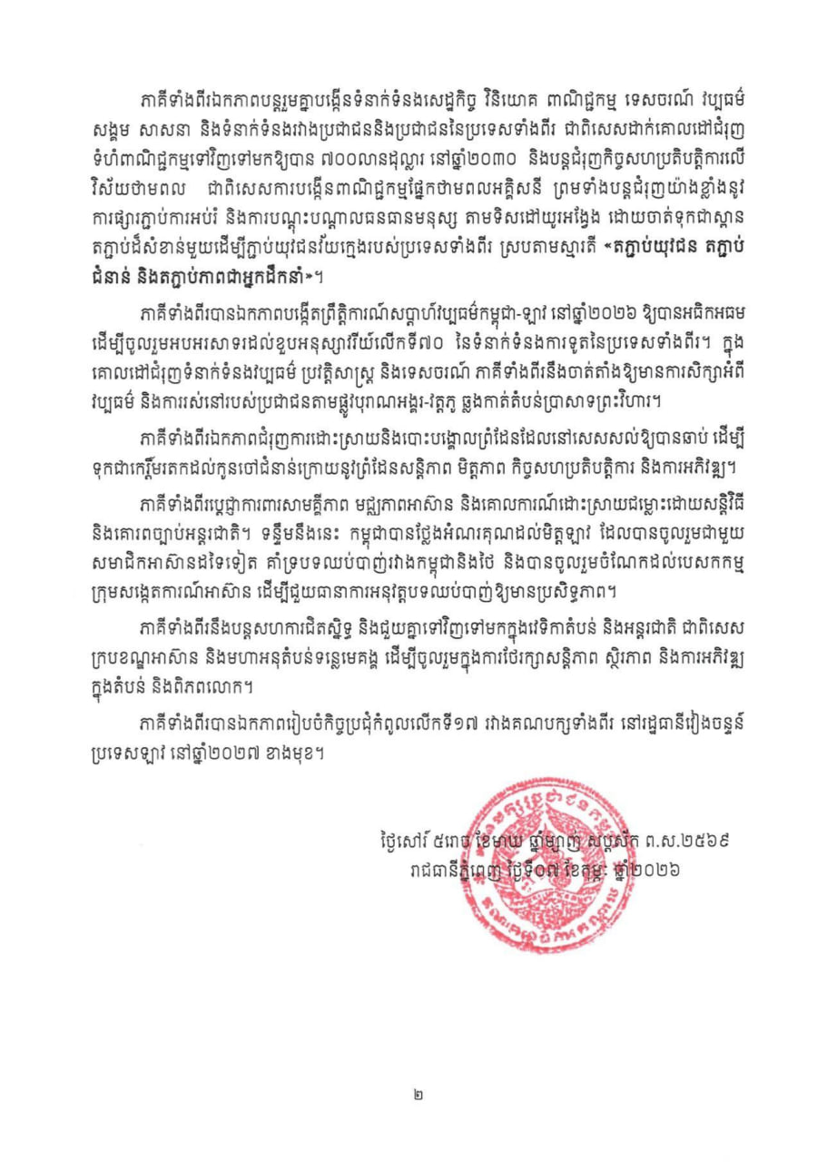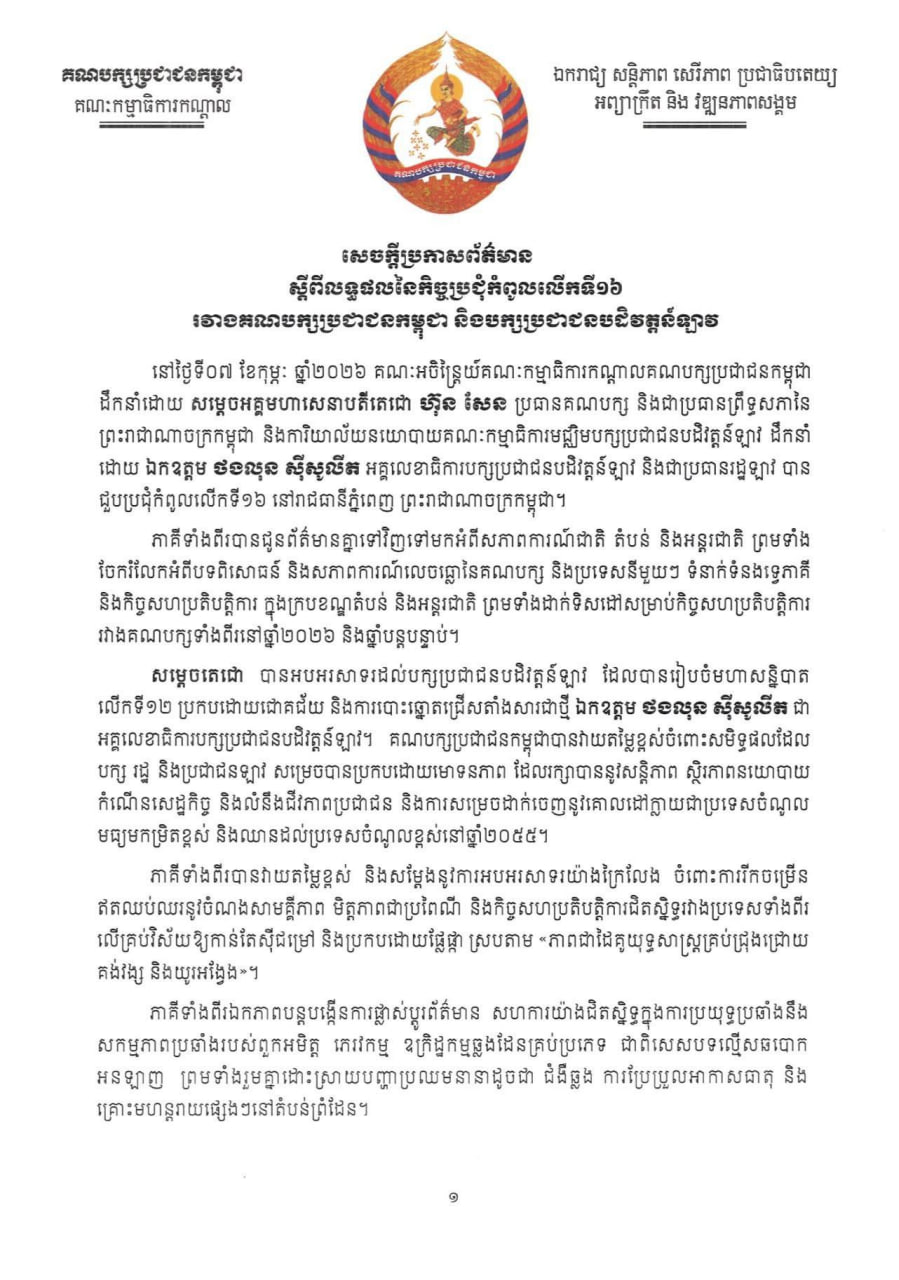 សេចក្តីប្រកាសព័ត៌មានស្ដីពីលទ្ធផលនៃកិច្ចប្រជុំរវាងគណបក្សប្រជាជនកម្ពុជា និងបក្សប្រជាជនបដិវត្តឡាវនាថ្ងៃទី៧ ខែកុម្ភៈ ឆ្នាំ២០២៦
