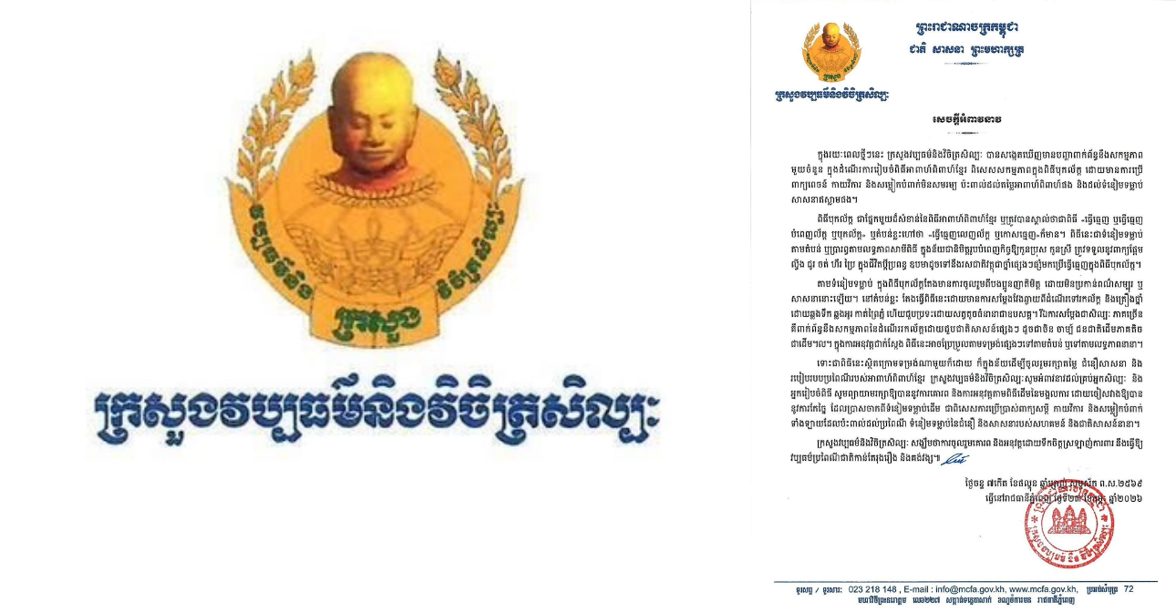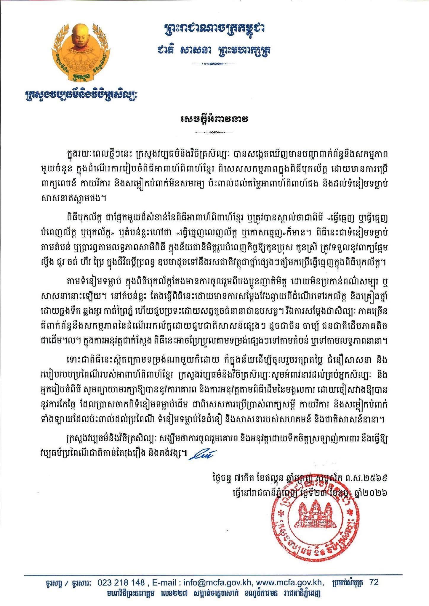 Home » ក្រសួងវប្បធម៍ និងវិចិត្រសិល្បៈ សេចក្តីអំពាវនាវ ក្នុងរយៈពេលថ្មីៗនេះ ក្រសួងវប្បធម៌និងវិចិត្រសិល្បៈ បានសង្កេតឃើញមានបញ្ហាពាក់ព័ន្ធនឹងសកម្មភាពមួយចំនួន ក្នុងដំណើរការរៀបចំពិធីអាពាហ៍ពិពាហ៍ខ្មែរ ពិសេសសកម្មភាពក្នុងពិធីបុកល័ក្ត ដោយមានការប្រើពាក្យពេចន៍ កាយវិការ និងសម្លៀកបំពាក់មិនសមរម្យ ប៉ះពាល់ដល់តម្លៃអាពាហ៍ពិពាហ៍ផង និងដល់ទំនៀមទម្លាប់សាសនាឥស្លាមផង