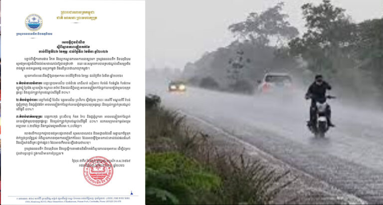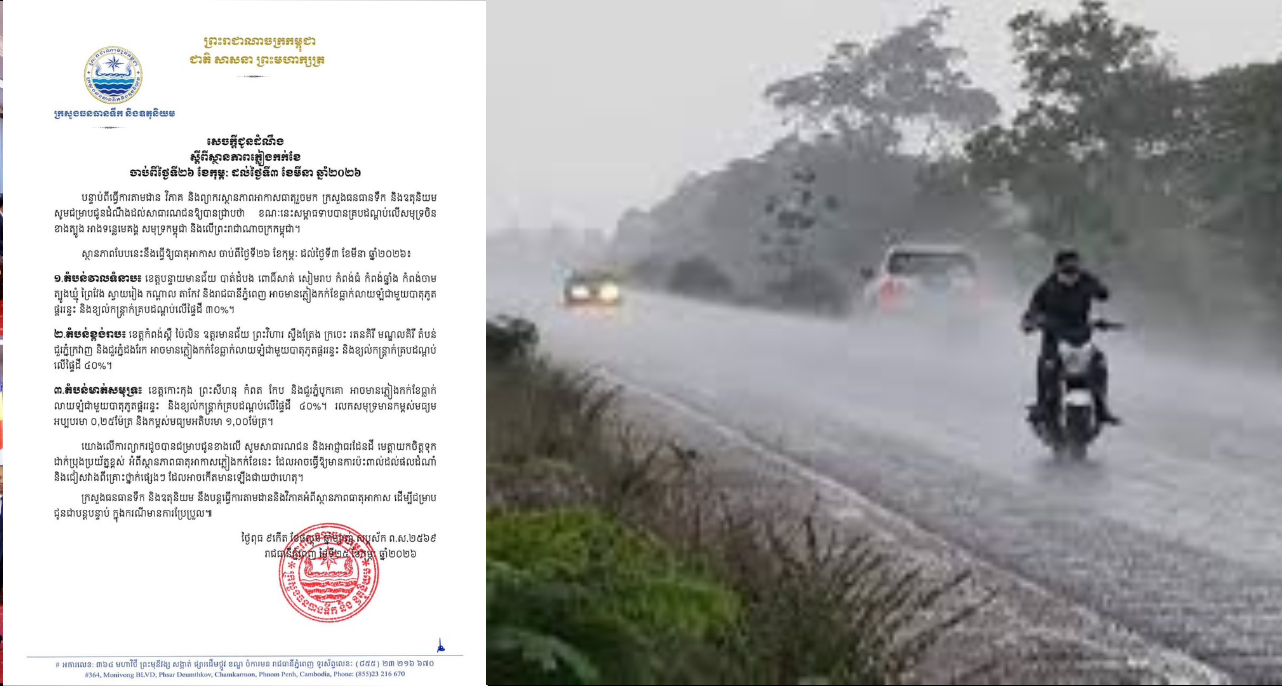 ភ្នំពេញ ៖ ក្រសួងធនធានទឹក និងឧតុនិយម បានណែនាំសាធារណជន និងអាជ្ញាធរដែនដី ត្រូវយកចិត្តទុកដាក់ប្រុងប្រយ័ត្នខ្ពស់ អំពីស្ថានភាពធាតុអាកាសភ្លៀងកក់ខែ ចាប់ពីថ្ងៃទី២៦ ខែកុម្ភៈ ដល់ថ្ងៃទី៣ ខែមីនា ឆ្នាំ២០២៦ ខាងមុខនេះ។