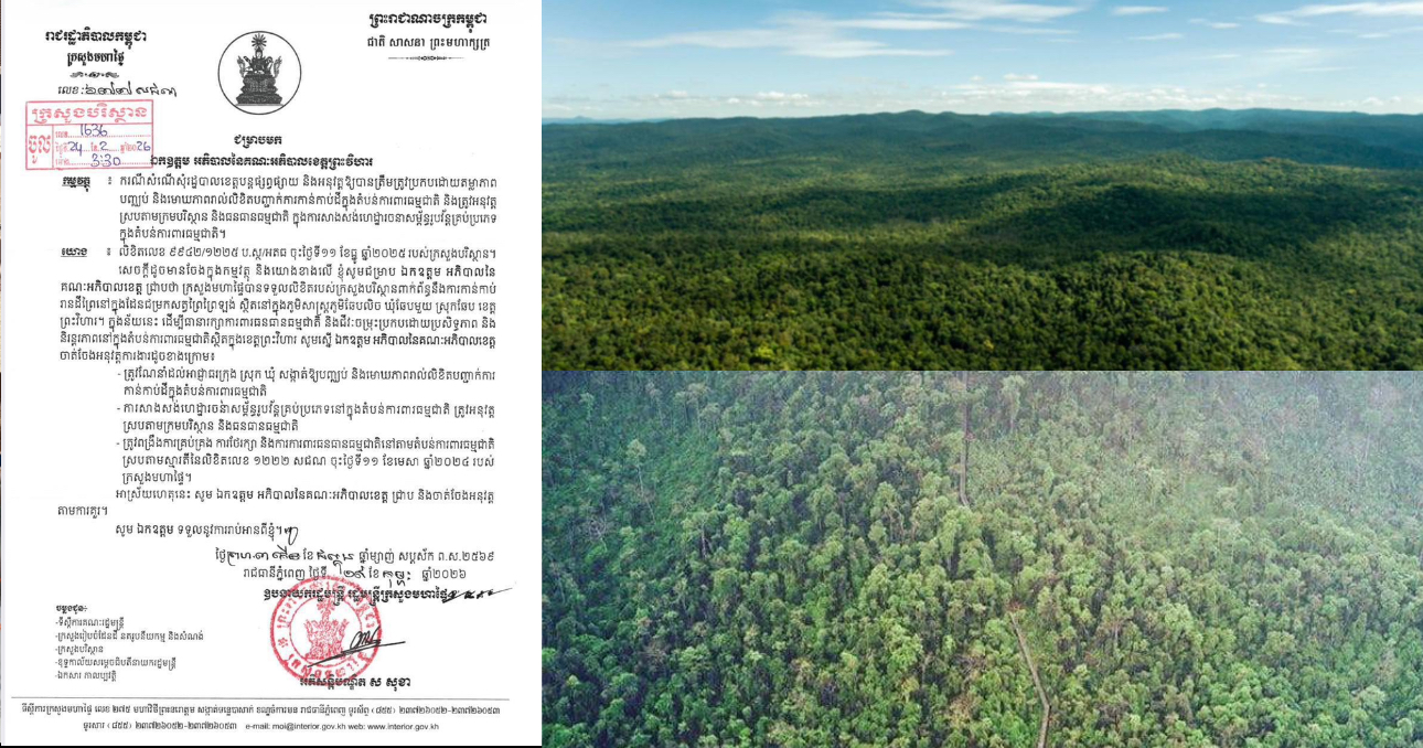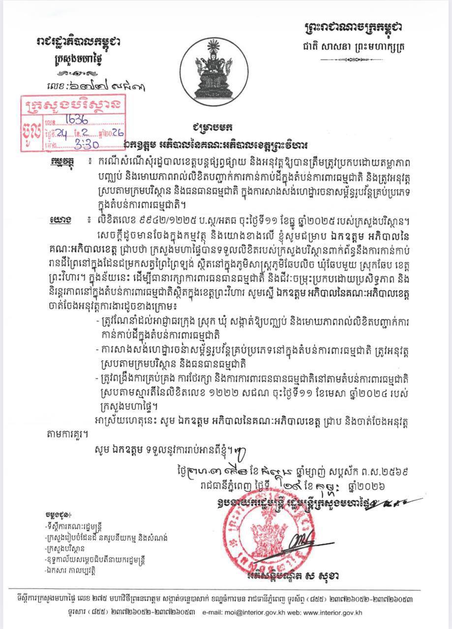 ក្រសួងមហាផ្ទៃ ប្រាប់ឱ្យអភិបាលខេត្តព្រះវិហារ ណែនាំអាជ្ញាធរក្រុង ស្រុក ឃុំ សង្កាត់ឱ្យបញ្ឈប់ និងមោឃភាពរាល់លិខិតបញ្ជាក់ការកាន់កាប់ដីក្នុងតំបន់ការពារធម្មជាតិ