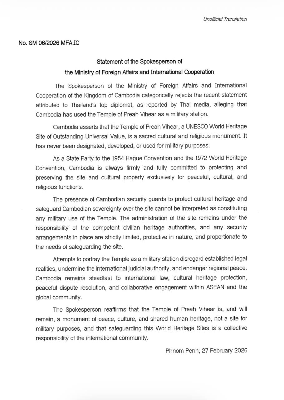 កម្ពុជា បដិសេធ យ៉ាងដាច់អហង្ការចំពោះការលើកឡើងថ្មីៗនេះ របស់អ្នកការទូតជាន់ខ្ពស់ប្រទេសថៃ ដែលចោទប្រកាន់ថា កម្ពុជាបានប្រើប្រាស់ ប្រាសាទព្រះវិហារ ជាទីតាំងយោធា