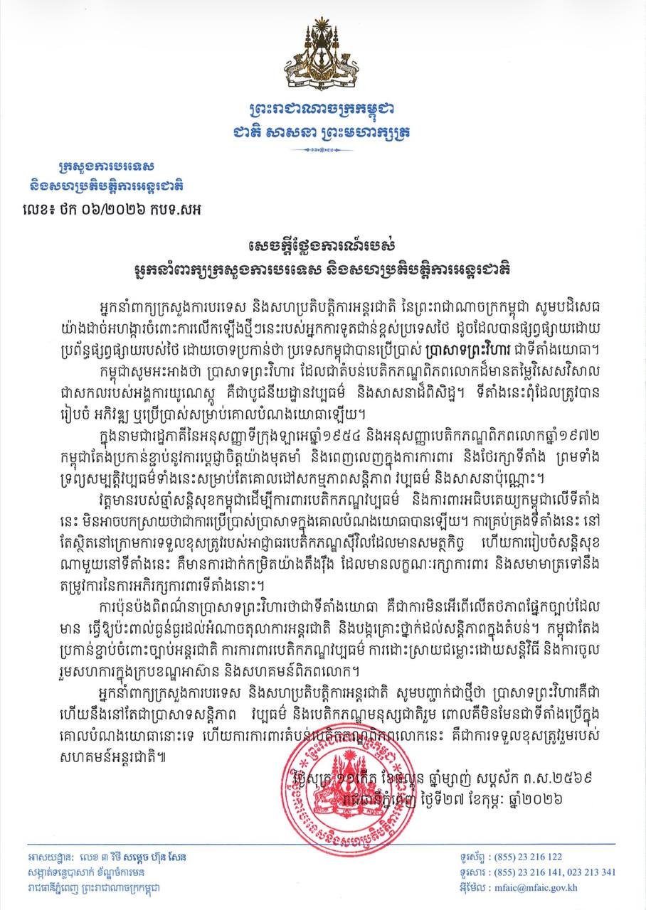 • សេចក្តីប្រកាសព័ត៌មាន កម្ពុជា តវ៉ាយ៉ាងដាច់អហង្ការចំពោះ​សកម្មភាព ខុសច្បាប់របស់ថៃដែលកាន់កាប់ដោយខុសច្បាប់នៅ​តំបន់ព្រំដែនកម្ពុជា